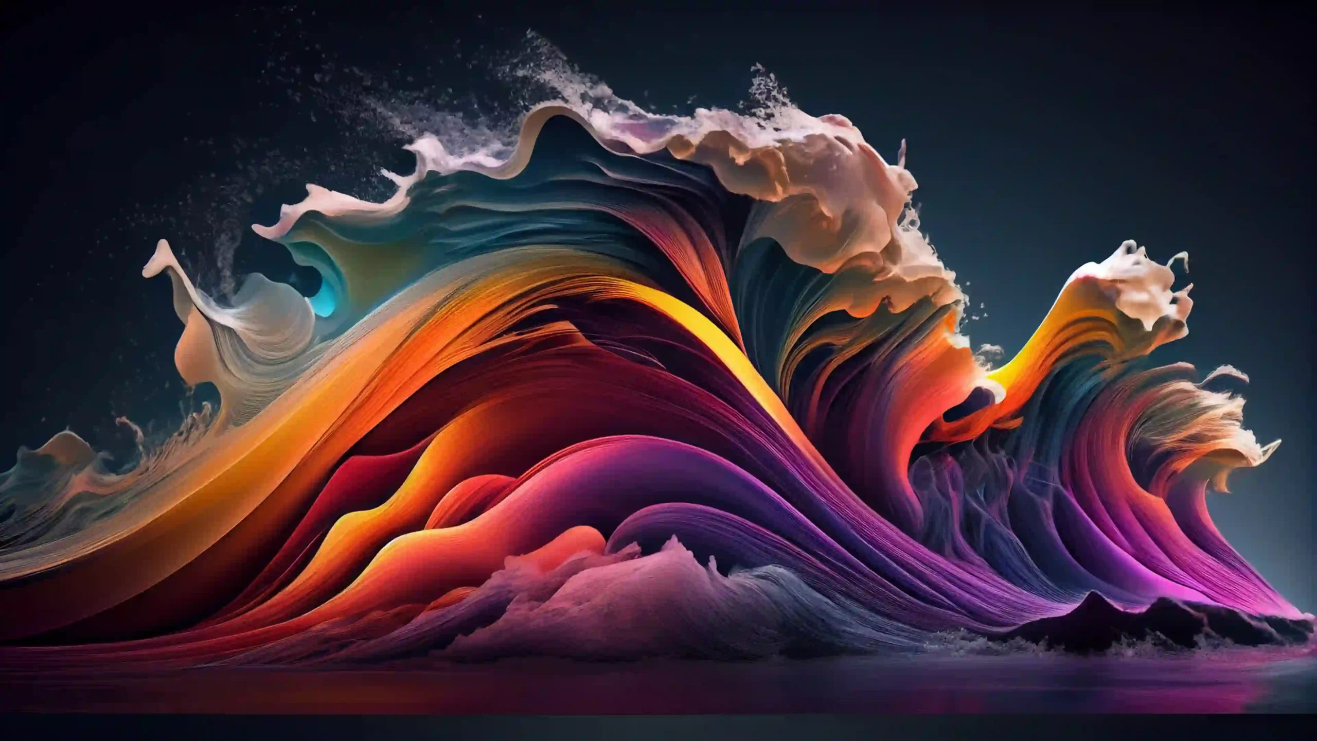 Dive into a sea of liquid color with this breathtaking 4K abstract wallpaper. Vivid layers of sunset orange, deep plum, and electric teal ripple together, forming the silhouette of a majestic, cresting mountain made of pure energy. Fine droplets of white mist spray from the peaks like sea foam, set against a deep, velvet-black void that allows every hue to pop with incredible intensity.