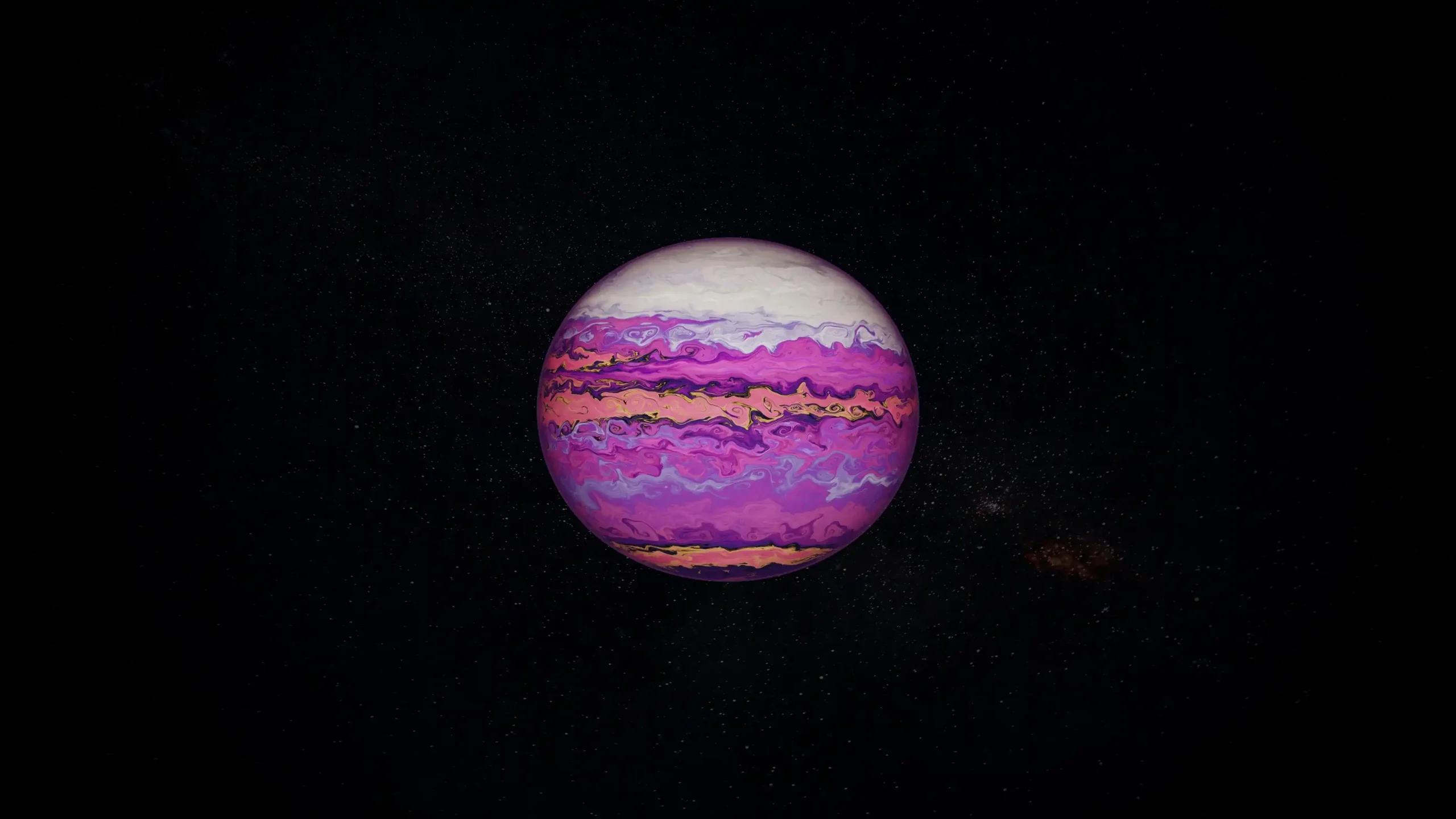 This magnificent Ultra HD wallpaper showcases a fictional celestial body, a gas giant or distant planet painted in impossibly vibrant colors. Suspended against the stark, star-dusted black of space, the sphere is dominated by incredible, chaotic bands of bright magenta, lavender purple, and warm coral pink, swirled together like painted marble. A cap of brilliant white sits at the top pole, contrasting with the intense central hues.