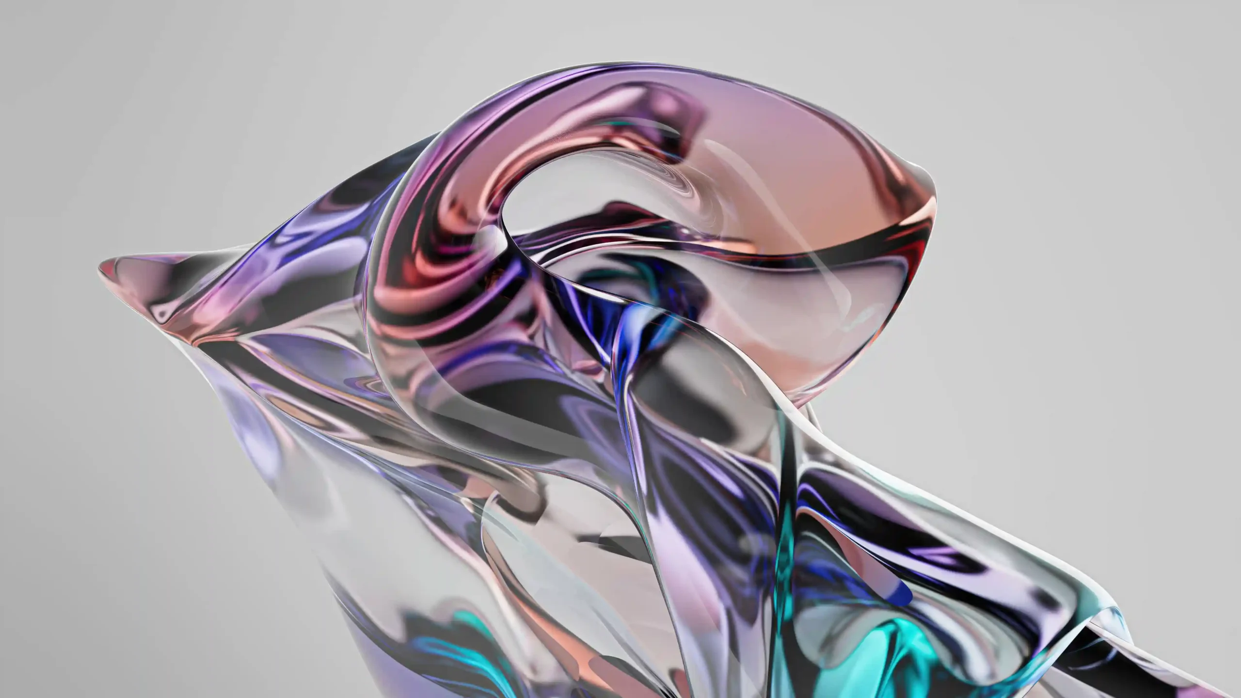 Transform your screen into a gallery of modern design with this mesmerizing 4K abstract wallpaper. The artwork features a complex, fluid sculpture of translucent glass-like ribbons that twist and fold with effortless grace. A vibrant spectrum of amber, violet, and deep turquoise flows through the material, catching the light to create a stunning prismatic effect against a clean, neutral backdrop.