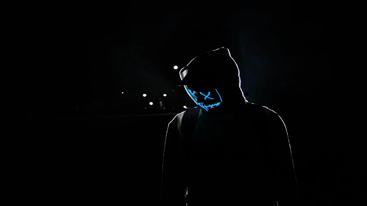 Dive into the mysterious depths of the night with this striking 4K wallpaper featuring a silhouetted figure adorned with a glowing neon mask. Against a stark, almost pitch-black background, the bright blue “X” eyes and stitched mouth of the mask illuminate the darkness, creating an eerie yet captivating presence. The figure’s hooded profile remains cloaked in shadow, enhancing the anonymity and intrigue.