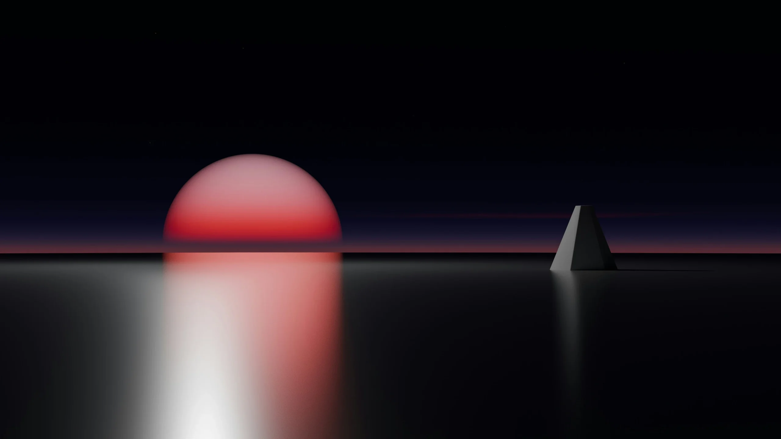 Immerse your workspace in the digital glow of a distant world with this striking 4K wallpaper. Featuring a massive, vibrant crimson sun sinking into a sleek, reflective black void, the image captures a moment of perfect geometric symmetry. A solitary, dark pyramid stands as a silent sentinel on the horizon, its sharp lines contrasting against the soft, atmospheric gradient of the twilight sky.