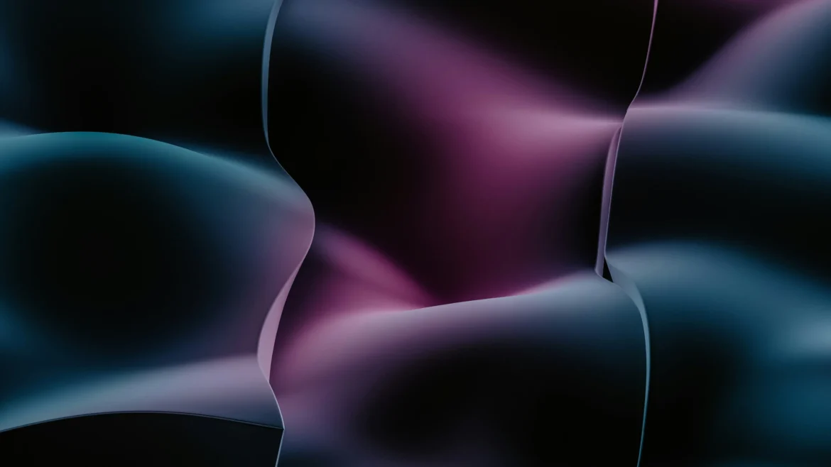 This captivating image features a minimalist study of soft, undulating forms and shifting light. Smooth, three-dimensional curves of a deep teal-blue fold inward, creating shadowed crevices that contrast with a central burst of smoky magenta and pink. The structure feels simultaneously solid and fluid, suggesting highly polished surfaces or the refraction of light through thick, flowing liquid. The subtle color gradients and dynamic shadowing give the composition an incredibly elegant and modern sense of depth.