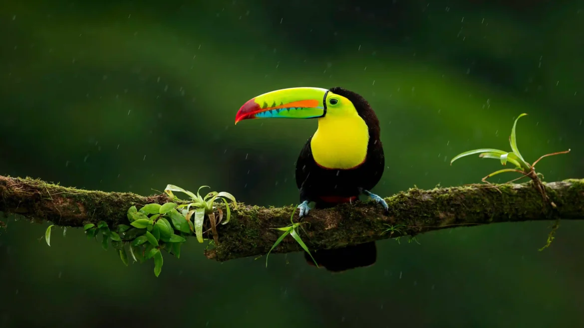 Capture the vibrant essence of the tropics with this stunning 4K wildlife wallpaper. The image features a magnificent Keel-billed Toucan perched alertly on a moss-covered branch amidst a gentle rainforest drizzle. Its iconic, rainbow-colored beak—splashed with lime green, orange, and crimson—stands out brilliantly against its sleek black plumage and bright yellow throat, embodying the exotic beauty of Central American jungles.