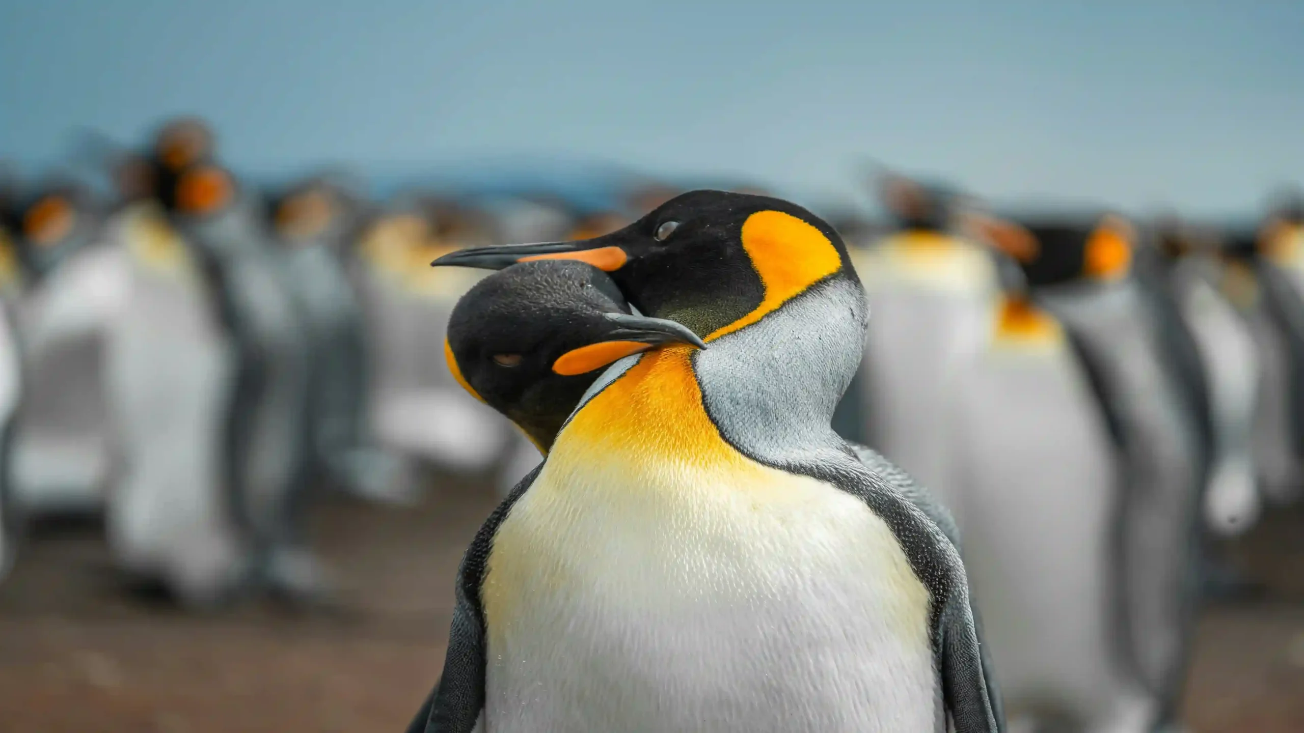 Step into a moment of pure, tender connection with this beautiful 4K wallpaper. It focuses on a pair of King Penguins, whose brilliant orange-gold neck patches and sleek black and white plumage are sharply rendered. They are captured in a gesture of profound affection, with one bird nestling its head comfortingly against the other’s neck. The background features a blurred, busy colony of other penguins, emphasizing the intimate bond between the central pair against the backdrop of their shared, vast world under a muted, blue-gray sky.