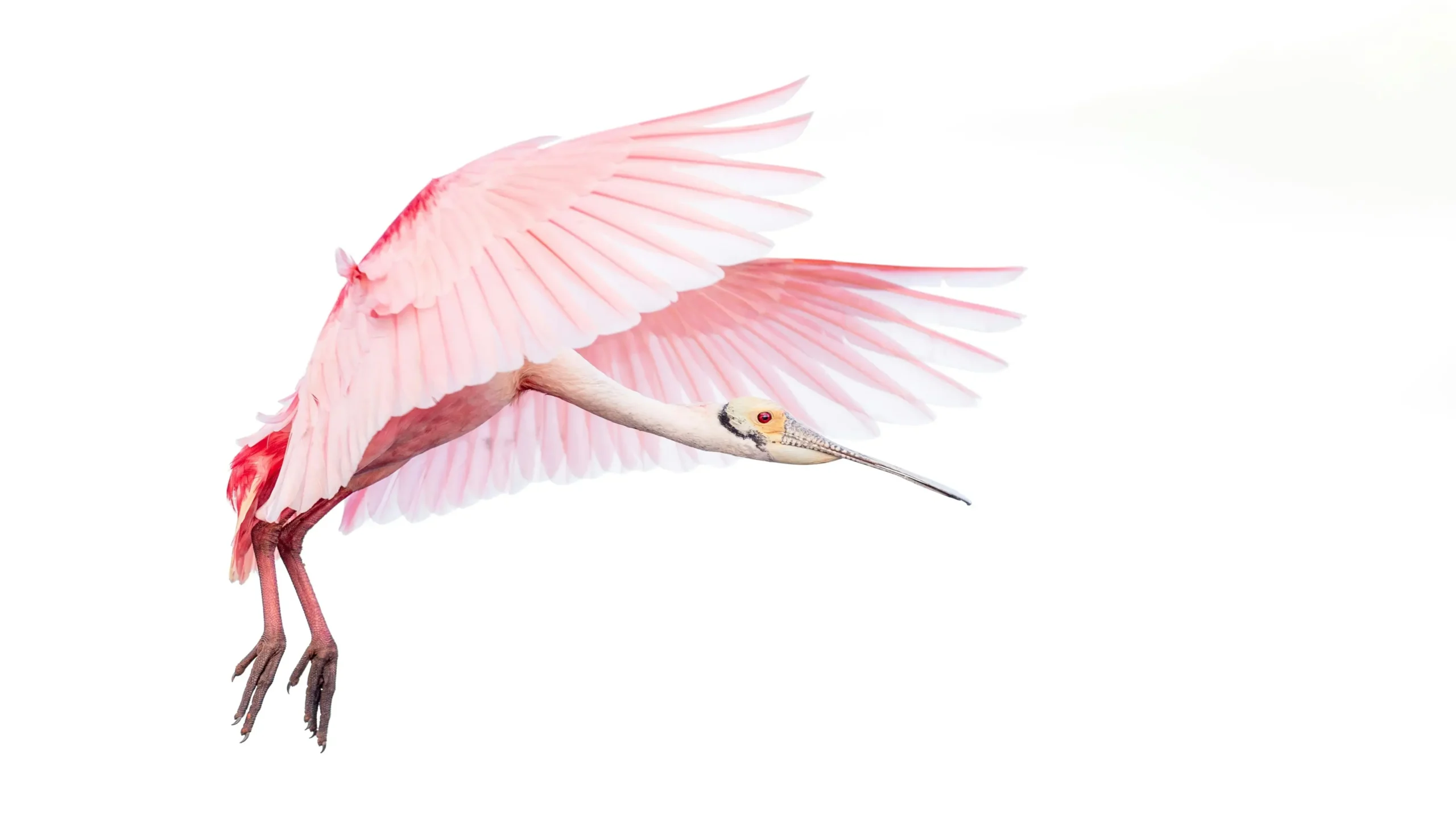 Capture the delicate beauty of the avian world with this stunning 4K wallpaper featuring a Roseate Spoonbill in mid-flight. The bird’s striking, bright pink plumage—especially the subtle gradients across its fully extended wings—creates a vibrant contrast against the stark, pure white background. The unique, spoon-shaped bill and intense red eye are sharply focused, highlighting the exotic and elegant nature of this wading bird.