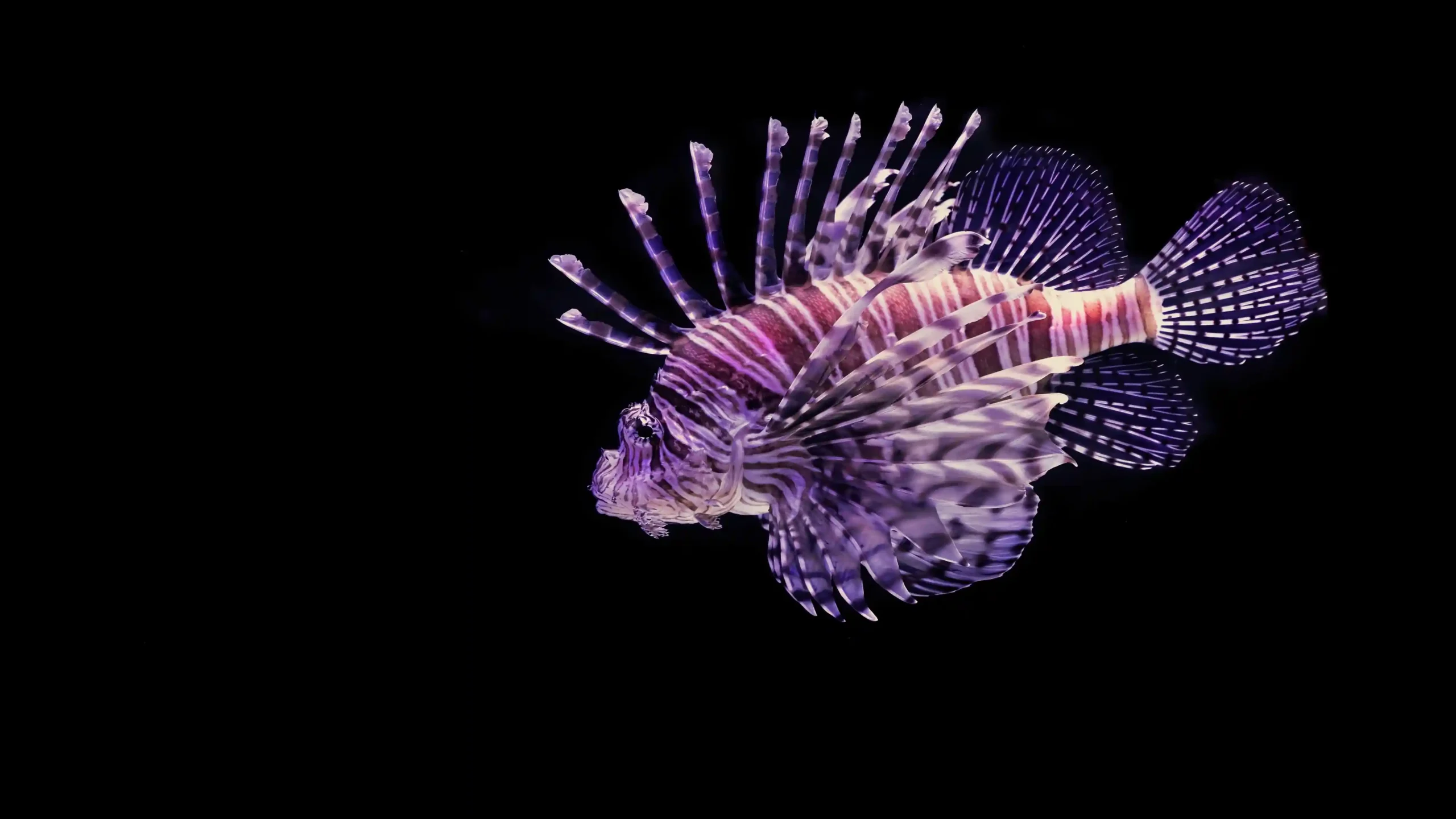 Immerse yourself in the dark beauty of the ocean with this mesmerizing 4K wallpaper. A venomous lionfish, with its dramatic, fan-like fins and striped body, floats elegantly against a stark black background. The deep purples and reds of its intricate pattern glow with an otherworldly light, making it a true jewel of the sea. The image is a striking portrait of natural artistry, showcasing the delicate yet dangerous beauty of a creature that moves with a silent, hypnotic grace.
