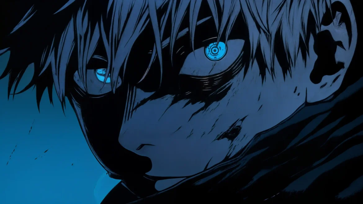 Pierce through the veil of reality with this striking 4K wallpaper of Jujutsu Kaisen’s strongest sorcerer. The image features a tight, dramatic close-up of Satoru Gojo, his face partially obscured by deep shadows and marked by the grit of battle. His legendary “Six Eyes” glow with an electric, cerulean brilliance, their intricate circular patterns signifying a level of perception and power that transcends the physical world.