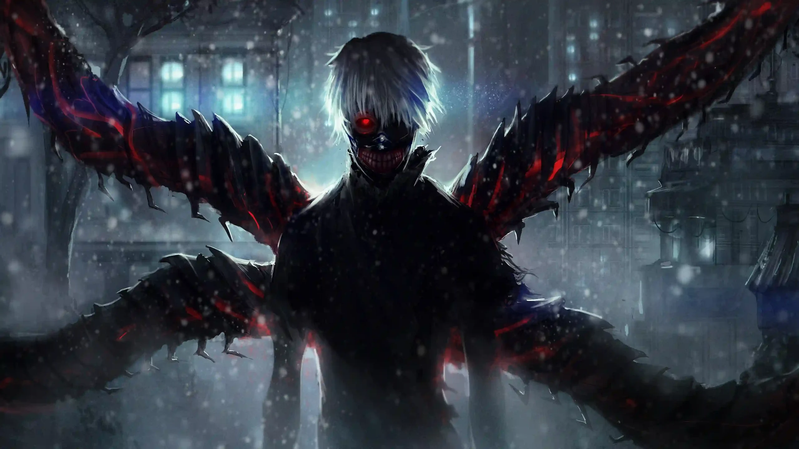 Immerse yourself in the dark, supernatural world of Tokyo with this haunting 4K wallpaper featuring Ken Kaneki. Set against a backdrop of a cold, snowy city night, the One-Eyed Ghoul stands with his iconic kagune unfurled, their crimson glow cutting through the wintry mist. The contrast between his stark white hair and the shadowy silhouette of his mask captures the tragic transformation of a man caught between two worlds.
