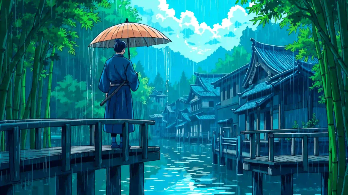 Step into a beautifully serene yet melancholic scene with this captivating 4K wallpaper, depicting a lone samurai overlooking a rain-kissed Japanese village. Dressed in a traditional blue kimono and holding an orange umbrella, the figure stands on a wooden bridge, gazing out over water-laced houses with classic tiled roofs. The vibrant green of bamboo stalks frames the scene, adding to the lush, natural atmosphere.