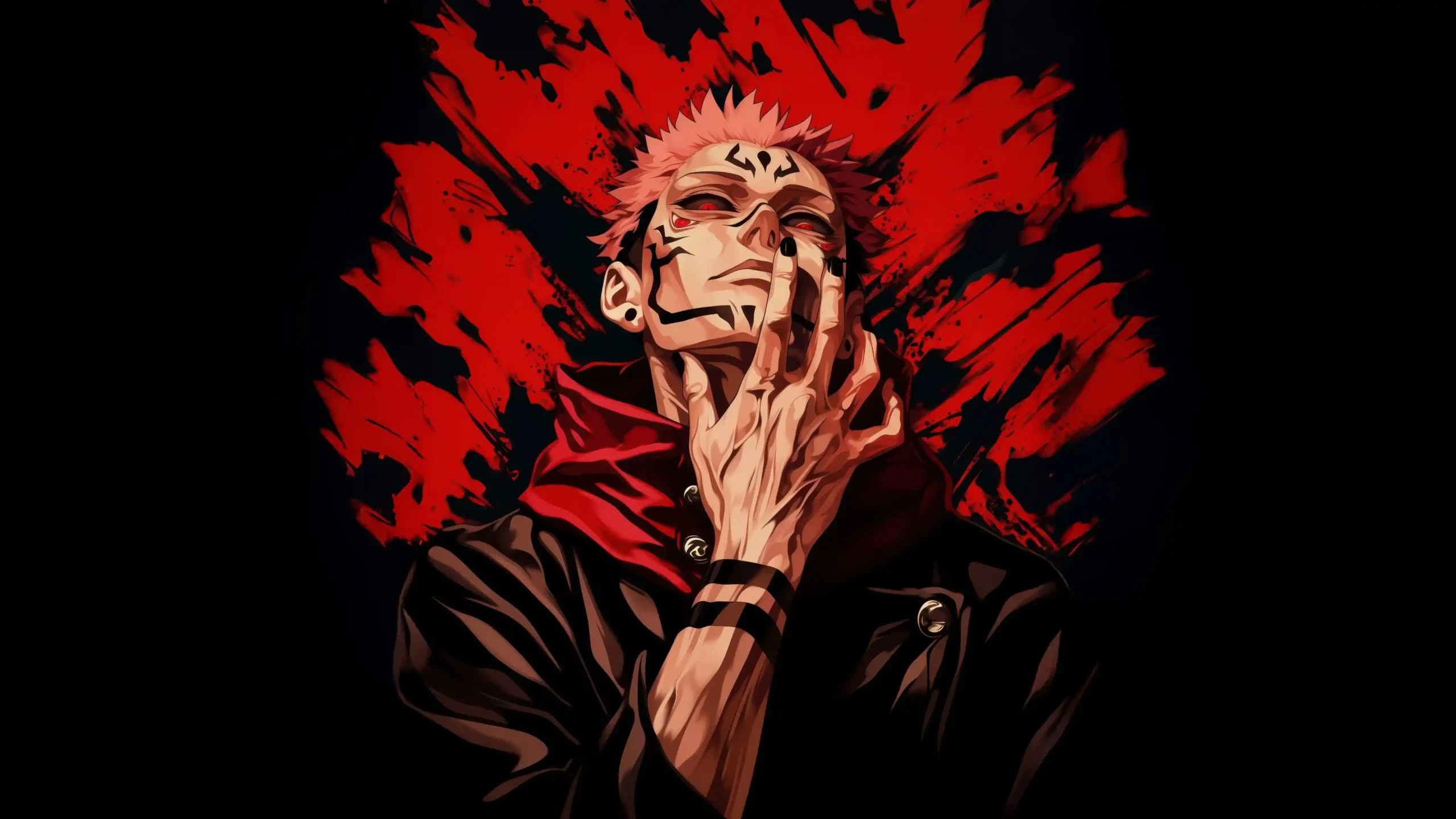 Dominating the frame with a terrifying, calculated grace, this 5K wallpaper captures the King of Curses in his peak form. Set against a violent splash of crimson that tears through the obsidian background, Sukuna gazes upward with a look of supreme disdain. Every jagged marking and sharp line of his form is rendered with lethal precision, while his clawed hand rests against his face—a gesture that is as much a taunt as it is a display of absolute boredom with his opposition.