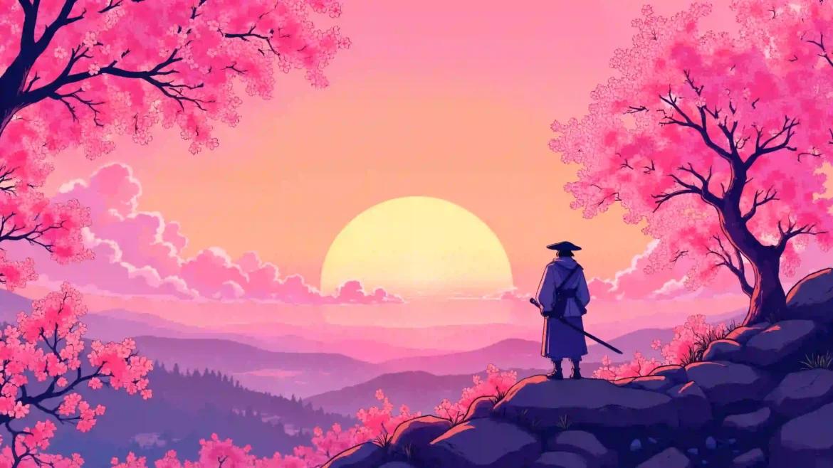 Bathed in the golden hush of twilight, a lone samurai stands beneath cherry blossoms, facing the sinking sun. The wind stirs softly through the petals, whispering tales of honor, sacrifice, and quiet strength.