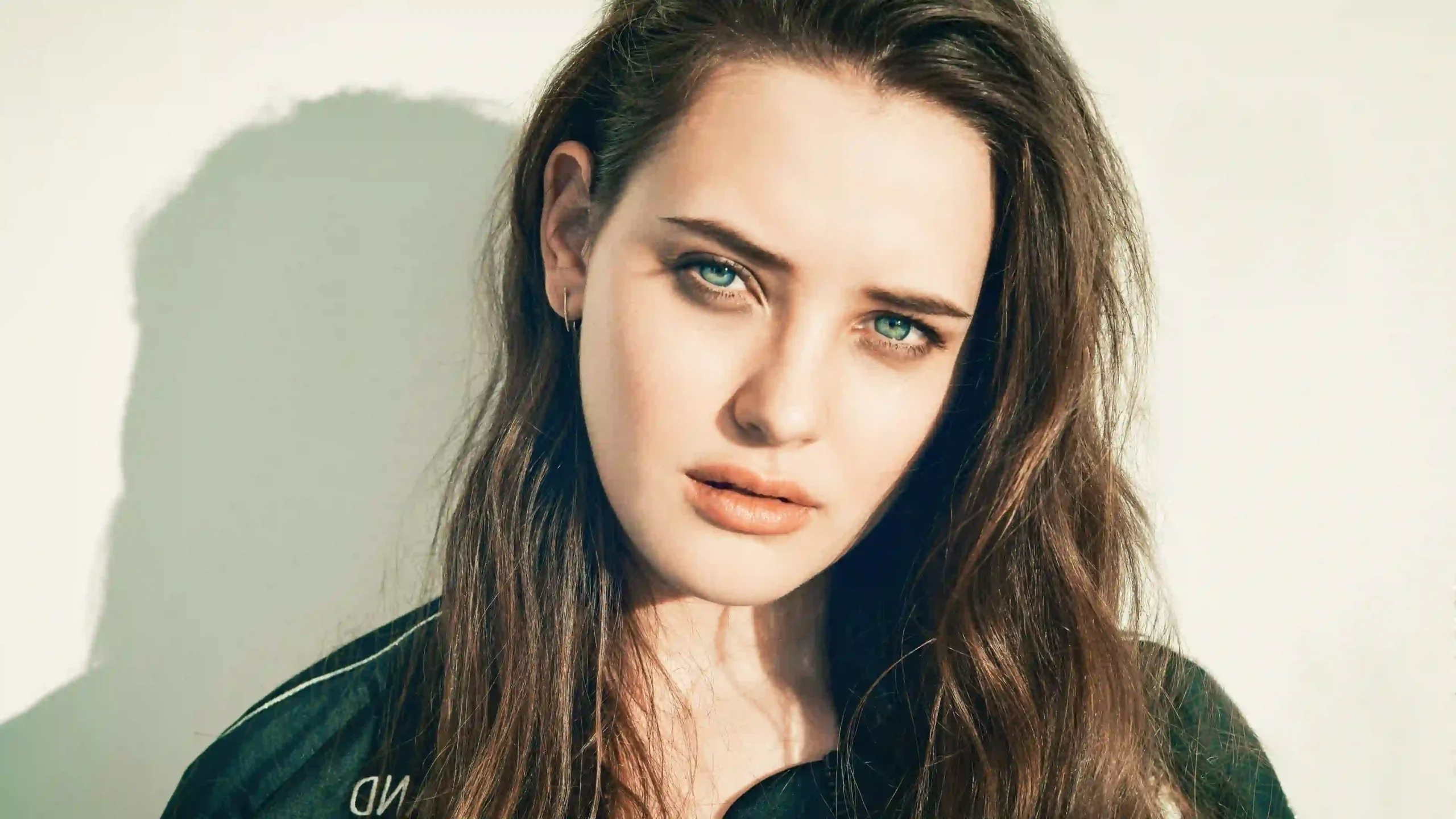 Illuminate your screen with the soft, cinematic beauty of this 4K portrait featuring actress Katherine Langford. Bathed in warm, natural light against a minimalist off-white background, the image focuses on her captivating sea-green eyes and relaxed, effortless style. Her dark, wavy hair cascades naturally over her shoulders, while a subtle shadow play on the wall adds a layer of depth and artistic intrigue to the composition.