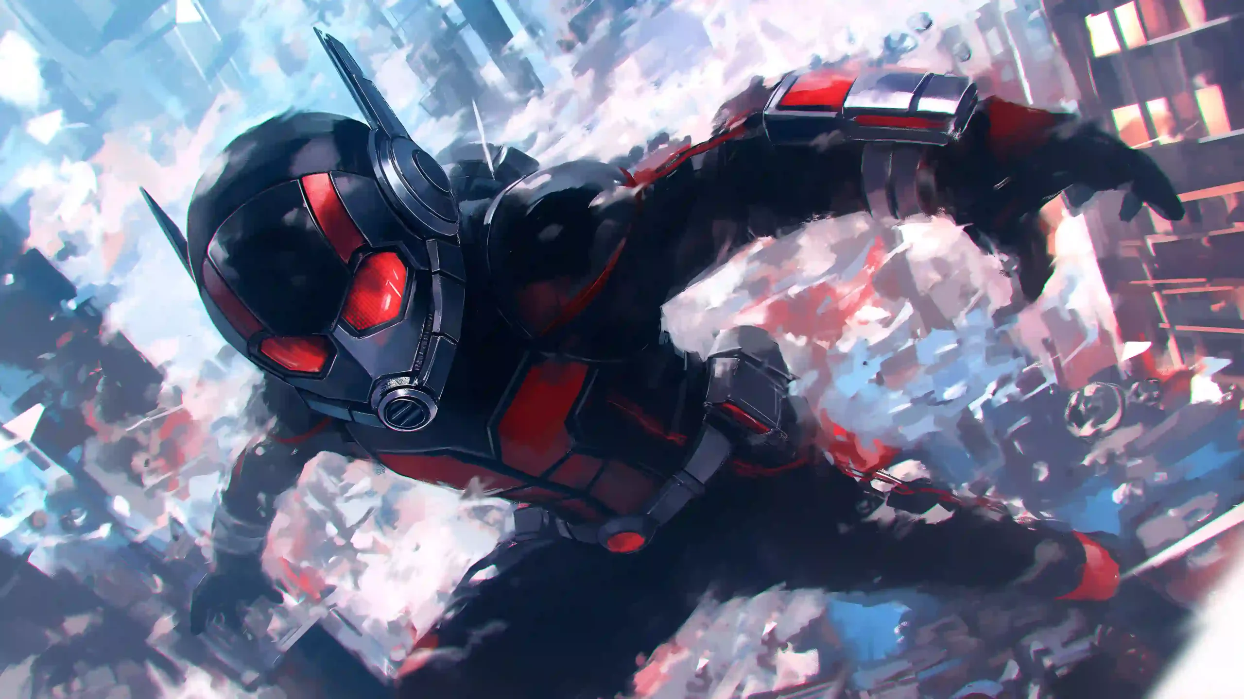 Witness the tiny but mighty Avenger in action with this high-octane 4K wallpaper featuring Ant-Man. The digital illustration captures Scott Lang in his signature red and black suit, mid-strike against a blurred, macro-style background of a modern city. The dynamic pose and painterly aesthetic emphasize the incredible speed and agility of the hero, bringing a sense of cinematic intensity to your high-performance display.