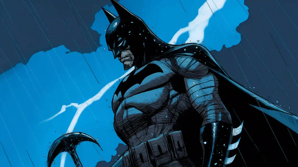 Immersion meets absolute intensity in this striking 4K wallpaper featuring the Caped Crusader. Amidst a relentless downpour, Batman stands as an unyielding pillar of justice, his silhouette sharply defined against a turbulent, electric blue sky. A sudden, jagged bolt of lightning tears through the clouds behind him, illuminating the grit on his cowl and the cold determination etched into his expression. Every drop of rain feels heavy with the atmosphere of Gotham’s darkest nights.