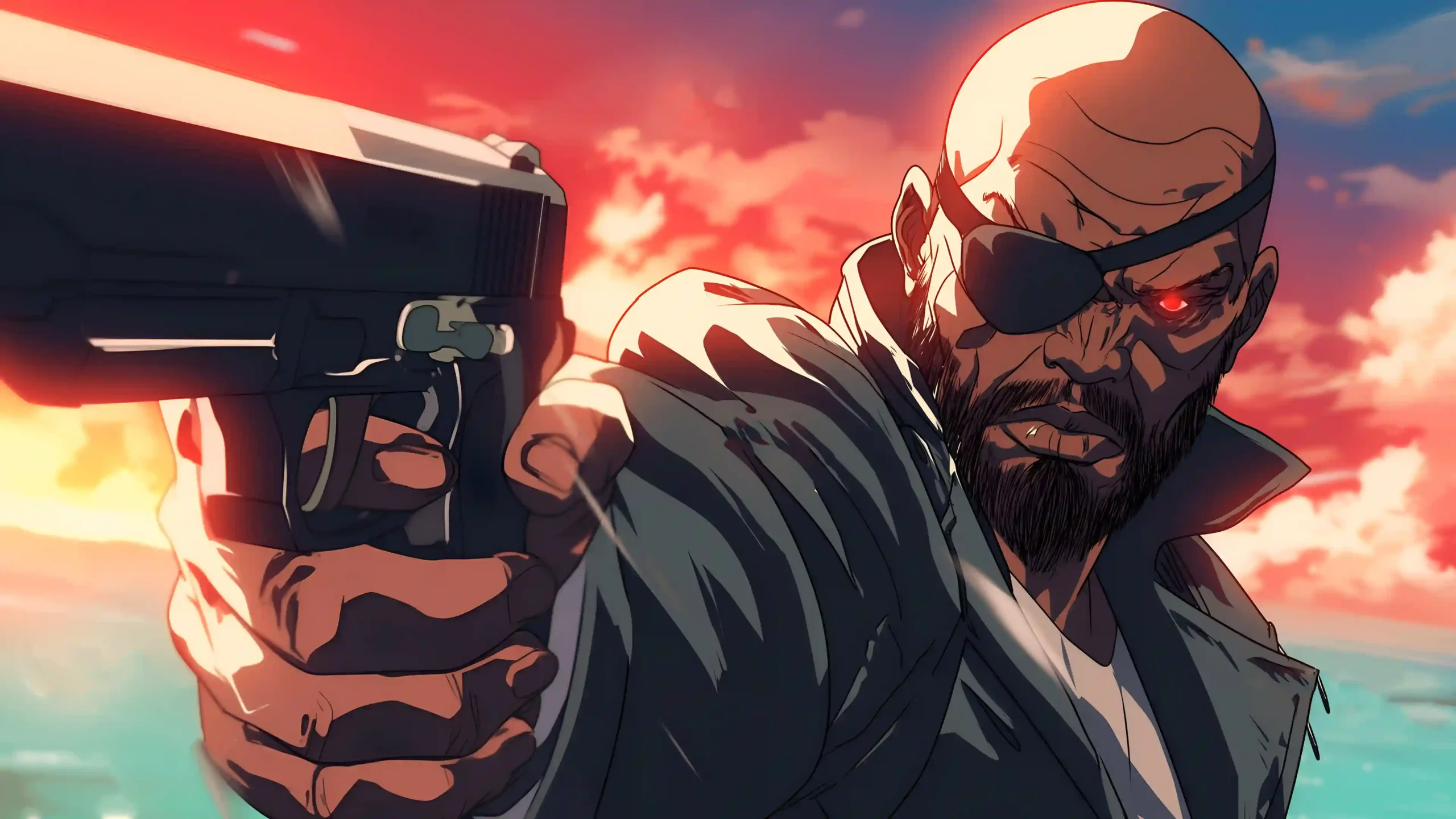 Witness the relentless determination of Marvel’s master strategist with this intense 4K wallpaper. Depicting Nick Fury in a bold, anime-inspired art style, the scene captures him leveling a handgun with unwavering focus. His iconic eye patch and weathered features are set against a vibrant, fiery sunset sky, with his bionic eye glowing a menacing red. The high-contrast shading and cinematic lighting emphasize the grit and “brutal” efficiency of the man who assembled the Avengers.