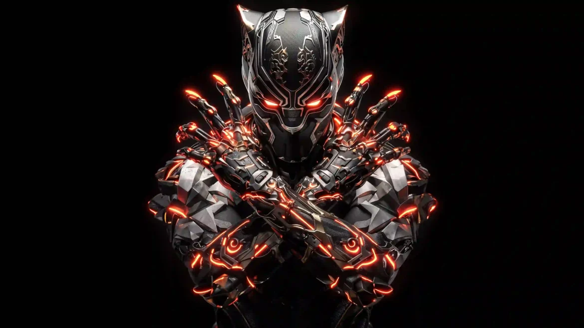A futuristic and highly detailed depiction of the Black Panther is centered against an absolute black void, emphasizing his intimidating, technological suit. The armor is a mosaic of metallic, geometric plates, but the focus is on the blazing red-orange neon energy that outlines his suit’s edges, claws, and eyes, suggesting a powerful charge or activation. With arms crossed in the iconic “Wakanda Forever” salute, the figure exudes fierce readiness, making this image a dramatic statement of protection and advanced power.