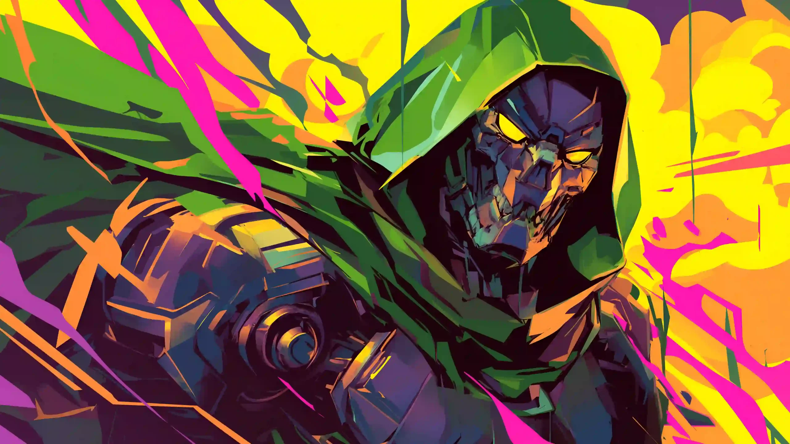 Exploding with chaotic energy and vibrant neon hues, this 4K wallpaper depicts Victor Von Doom in a style that is as loud as it is intimidating. Shards of electric pink, acid yellow, and deep purple collide in the background, framing the iron-clad sovereign in a storm of digital expressionism. His iconic green hood and cold, metallic mask stand as a grounded anchor amidst the surrounding color, his glowing yellow eyes piercing through the visual noise with unwavering dominance.