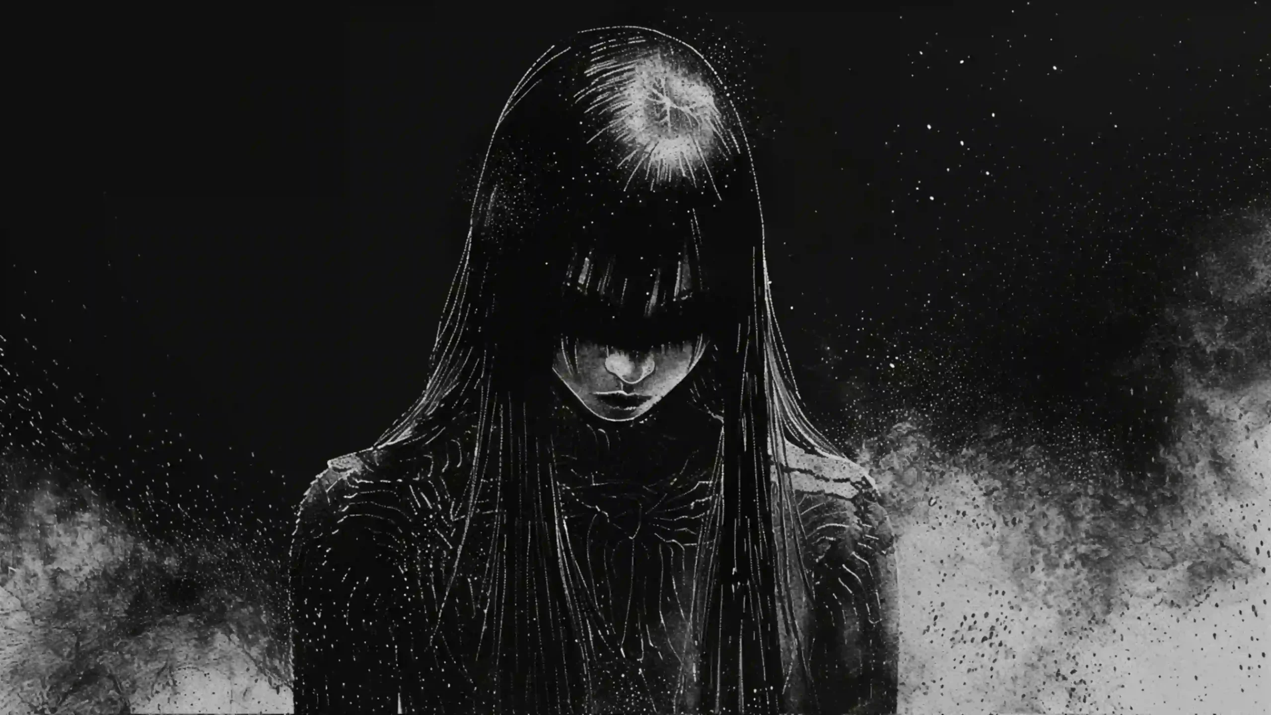 Bring a profound sense of introspection to your screen with this poignant 4K wallpaper. The image presents a woman’s silhouette in a striking monochrome style, with her head gently bowed and her long hair obscuring her face, creating a sense of anonymity and deep contemplation. The subtle details and textures, particularly in her hair and clothing, suggest intricate depth even within the dark tones. The surrounding darkness is punctuated by a fine mist or particles, adding to the ethereal and somewhat melancholic atmosphere.
