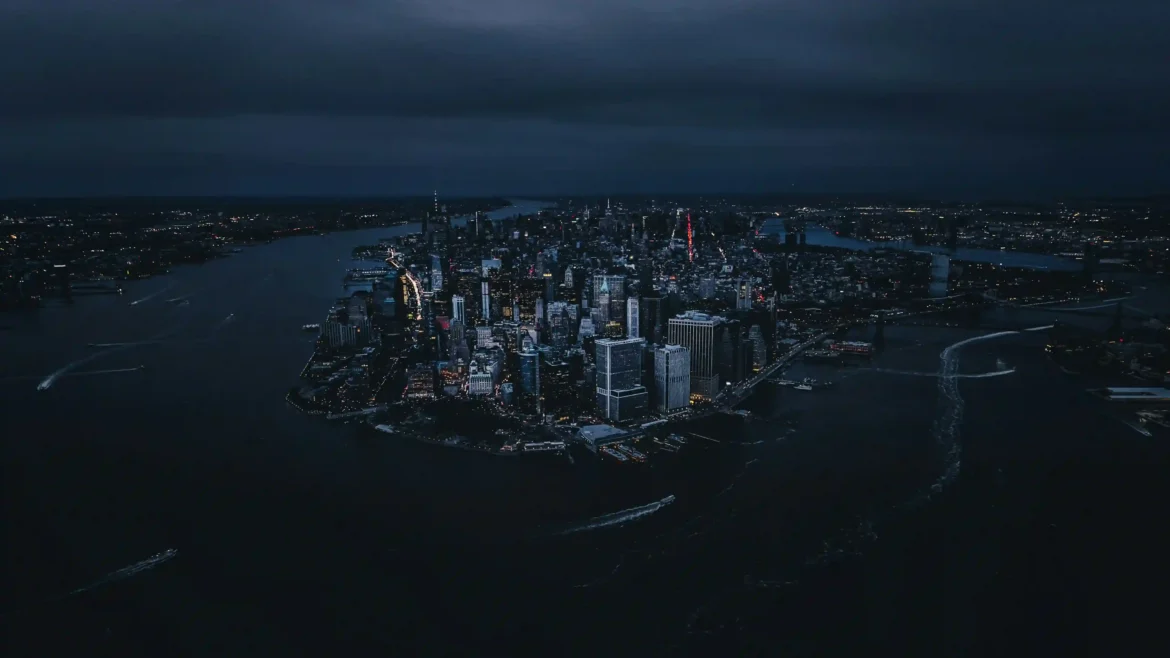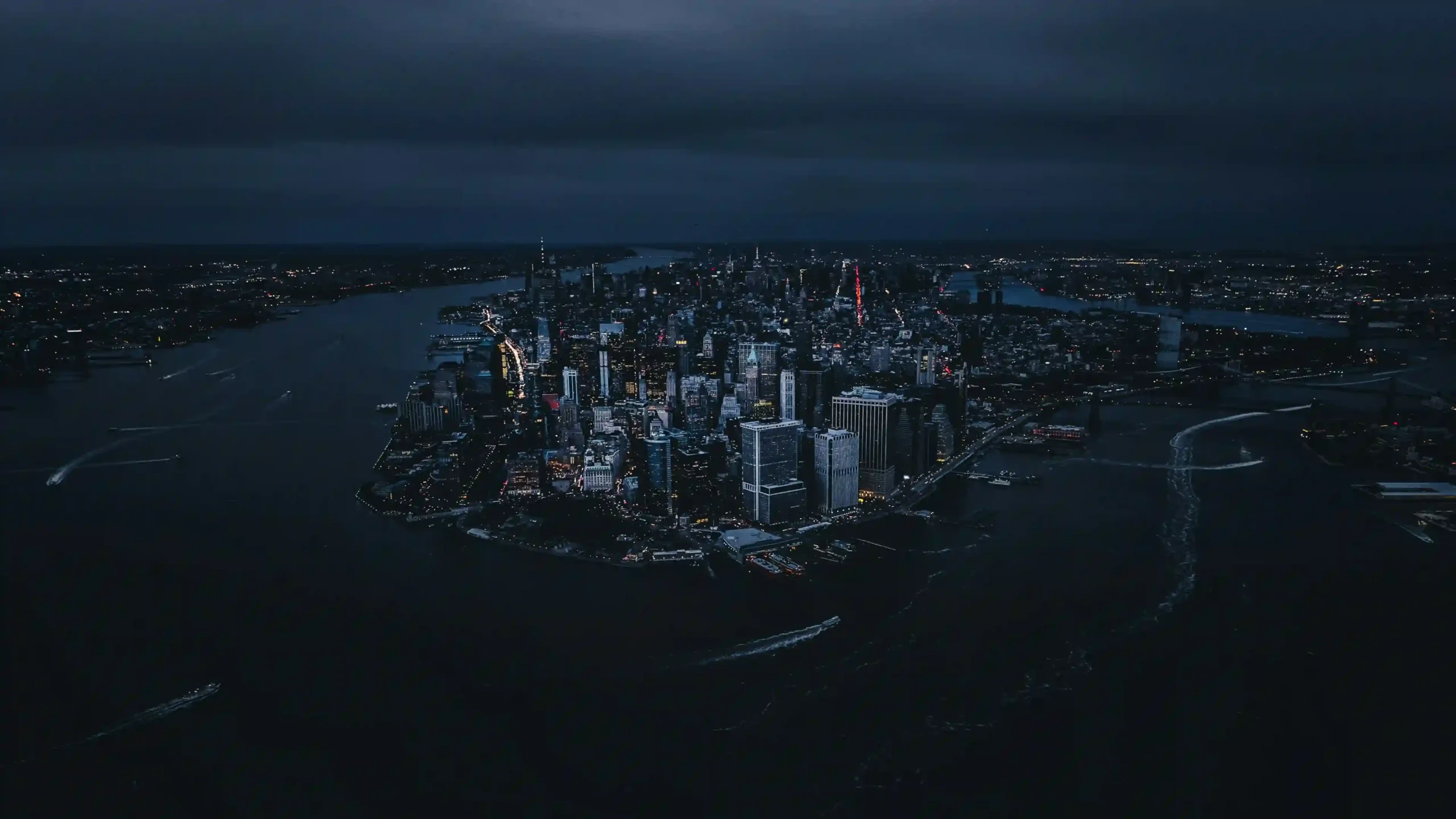 Gaze upon the sprawling majesty of a sleeping titan with this breathtaking aerial 4K wallpaper of a modern metropolis at night. The city unfolds like a glowing circuit board between deep, ink-black waters, with clusters of skyscrapers piercing the low-hanging gloom. Wispy trails of white foam from distant ships cut through the dark river, while a few select windows and red aviation lights pulse with life, creating a hauntingly beautiful contrast against the dense, navy-blue shadows of the urban landscape.