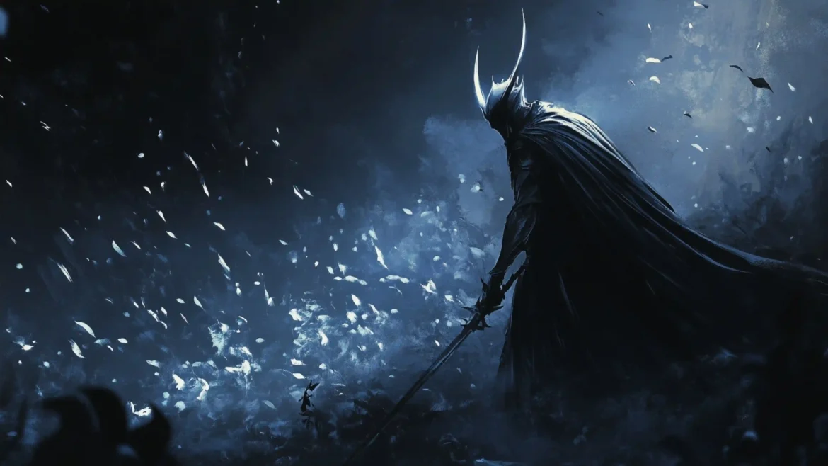 Immerse your screen in the mysterious depths of dark fantasy with this striking 4K wallpaper. A formidable, horned knight or shadowy warrior stands in a desolate, misty landscape, his dark cloak billowing around him. He grips a large sword, its tip resting on the ground, while swirling white particles, perhaps snow or ethereal dust, dance around him. The monochromatic blue-grey palette, accented by the stark whites, creates an atmosphere of somber power and enigmatic solitude. This image is perfect for fans of epic fantasy and brooding heroes.