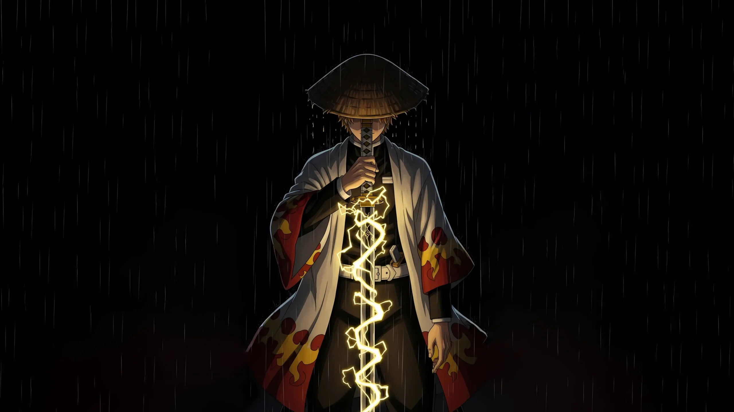 Amidst a relentless downpour, a sudden flash of gold cuts through the oppressive darkness. Zenitsu Agatsuma stands poised in the center of the storm, his iconic straw hat shielding his eyes as he grips the hilt of his Nichirin sword. The air crackles with lethal energy, and a vibrant bolt of lightning wraps around the blade like a living entity, signaling the calm before a devastating strike.