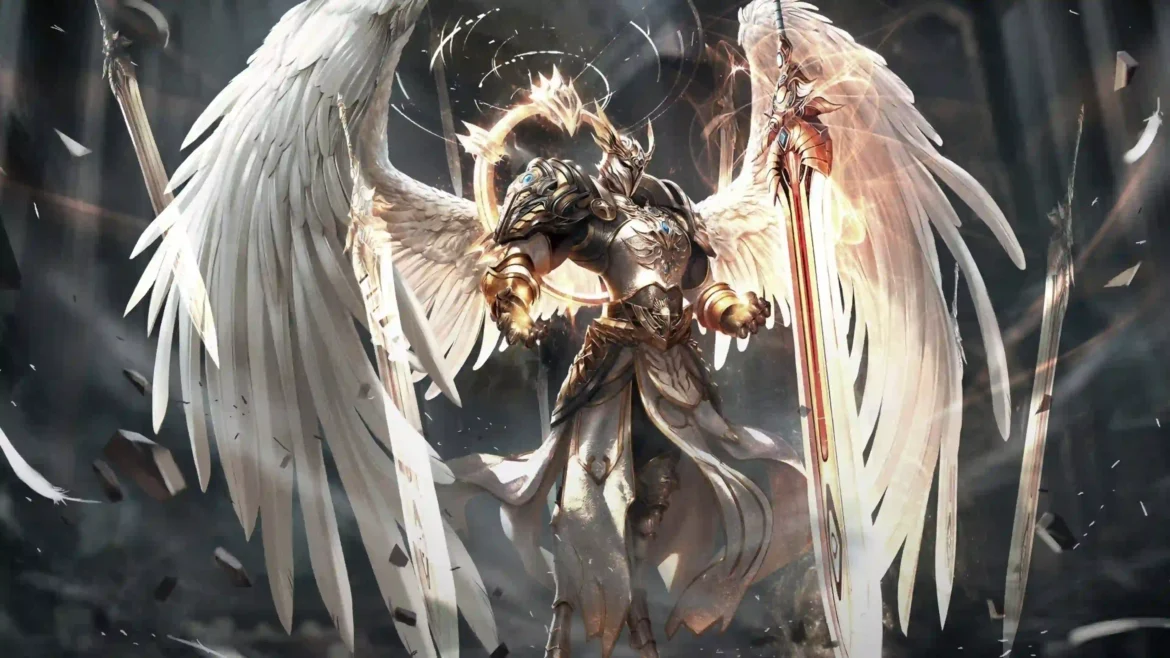 Adorn your screen with the breathtaking power of this 4K wallpaper featuring a magnificent archangel. Draped in resplendent golden and silver armor, this divine warrior stands tall with colossal, radiating white wings unfurled, suggesting immense power. In one hand, a gleaming, luminous sword is held aloft, while a halo of light circles above its helmeted head, casting an ethereal glow. Surrounding debris and a dramatic, smoky background hint at a recent or impending celestial battle, capturing the essence of both might and grace.