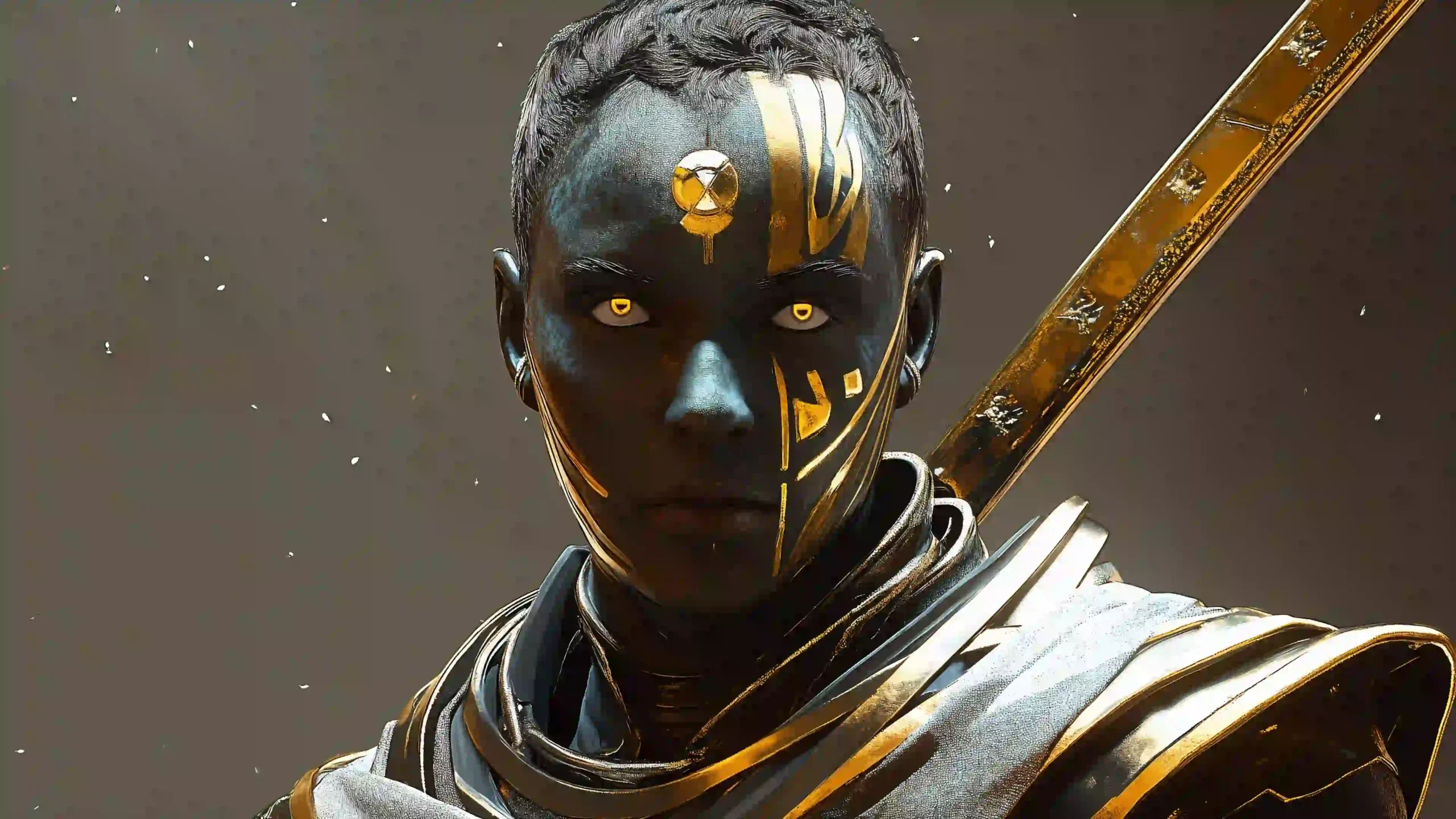 Witness the fusion of ancient tradition and futuristic art with this breathtaking 4K digital portrait. The composition focuses on a formidable warrior of the “Aurelian Vanguard,” their deep, obsidian-toned skin serving as a canvas for intricate, high-gloss gold leaf markings. Their eyes glow with a piercing, supernatural amber light, mirroring the golden hilt of the massive blade strapped to their back. Small, luminous particles drift through the warm, diffused background, suggesting a moment of calm before a cosmic storm.