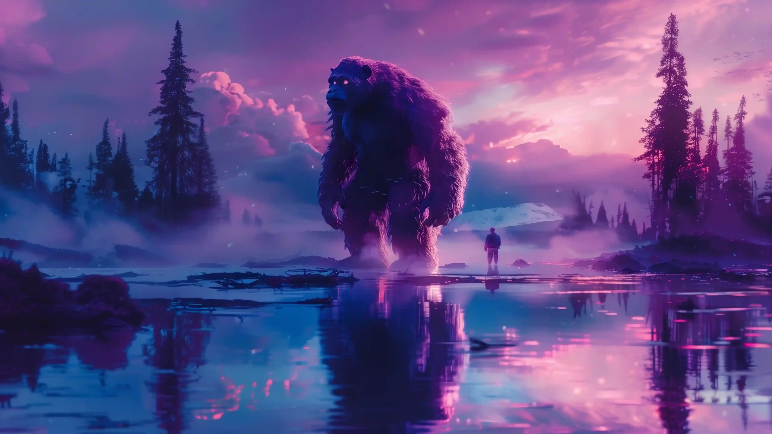 Step into a world where folklore meets a vibrant, futuristic dreamscape with this mesmerizing 4K wallpaper. Rising from the mist of a tranquil alpine lake, a colossal Bigfoot stands as a silent sentinel under a breathtaking violet and magenta sky. The creature’s massive, fur-covered silhouette is rimmed with a soft neon glow, reflecting off the glass-like water alongside the towering pines and distant, snow-capped peaks. A lone human figure stands on the shore, dwarfed by the sheer scale of the cryptid, marking a moment of quiet, transcendental connection.
