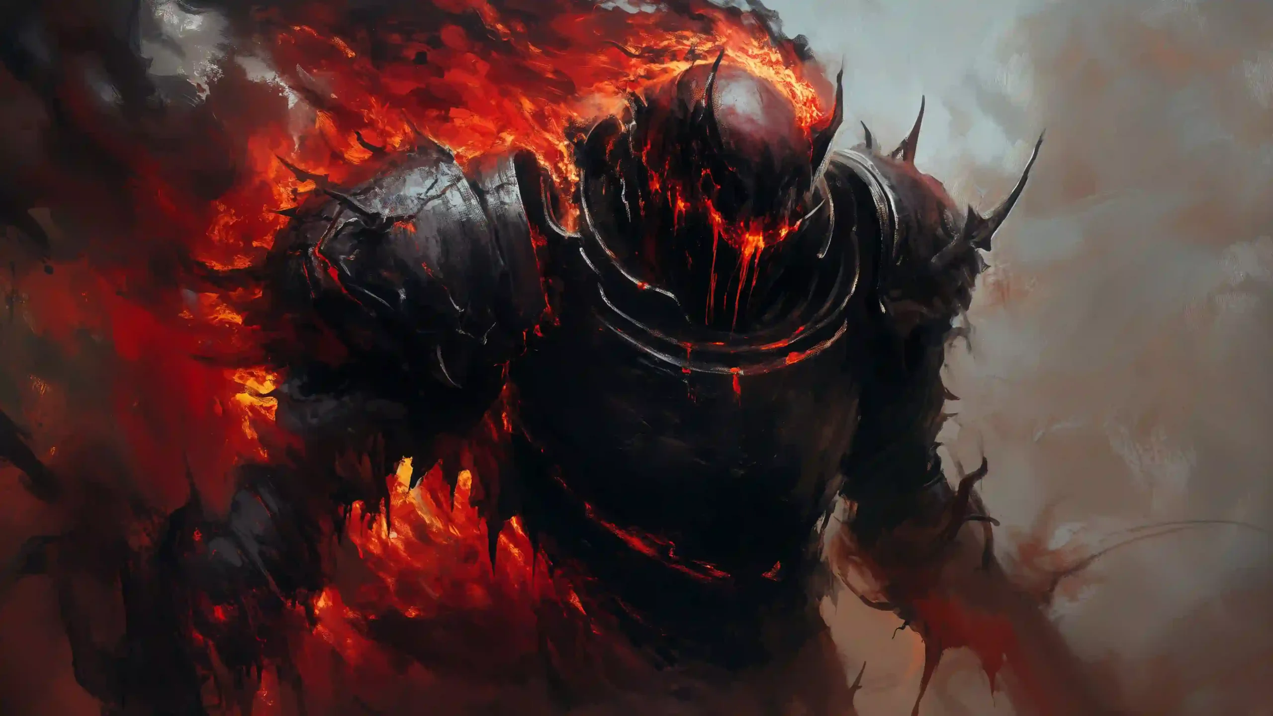 Engulfed in a maelstrom of violent heat and smoldering embers, this 4K wallpaper features a massive, dark-armored juggernaut consumed by eternal flames. The knight’s heavy plate armor, forged from obsidian-colored iron, is wreathed in roaring plumes of crimson and orange fire that lick the edges of the frame like a living entity. From within the depths of the spiked helm, a malevolent, molten glow bleeds out, signaling a spirit that has long traded its humanity for the raw power of the forge.