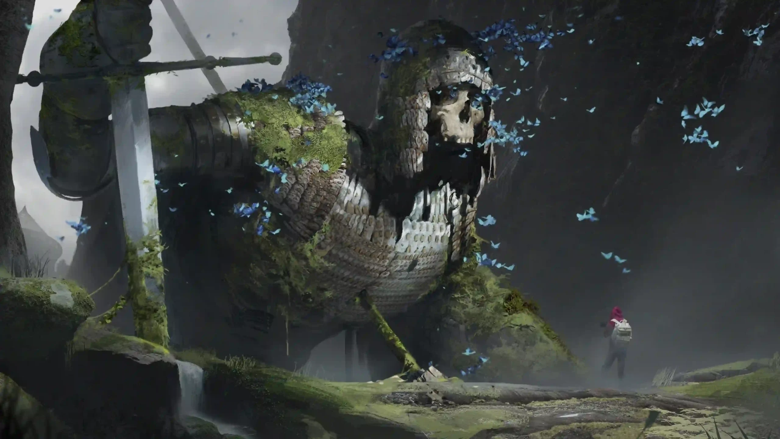 Venture into a realm where history and nature intertwine with this hauntingly beautiful 4K fantasy wallpaper. The artwork depicts the gargantuan remains of a fallen armored titan, now a permanent part of the landscape. Overgrown with moss and vibrant green flora, the skeletal sentinel rests in a misty mountain pass, surrounded by a swirling cloud of ethereal blue butterflies that breathe life into the silent, stony grave.