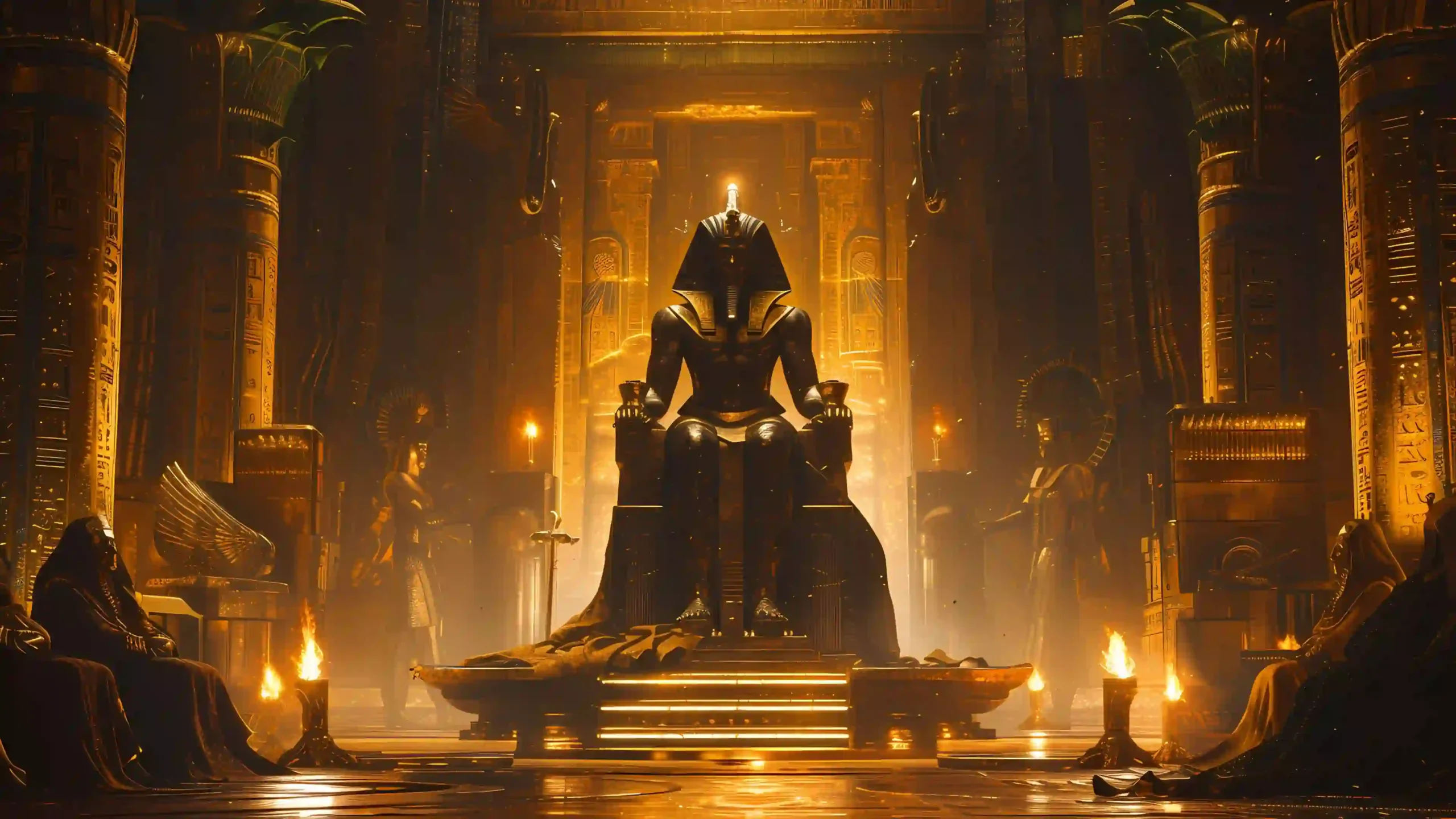 This breathtaking image depicts a colossal, black-stone statue of an ancient ruler, possibly a representation of Anubis or an empowered pharaoh, seated on a massive throne within a sumptuous, golden temple hall. The entire chamber is bathed in the warm, flickering glow of numerous torches and candles, which illuminate the intricate hieroglyphs and towering, lotus-column architecture. The central figure wears a majestic headdress and is surrounded by shadowed figures in robes, creating an atmosphere of sacred ritual and immense, divine power long guarded by darkness.