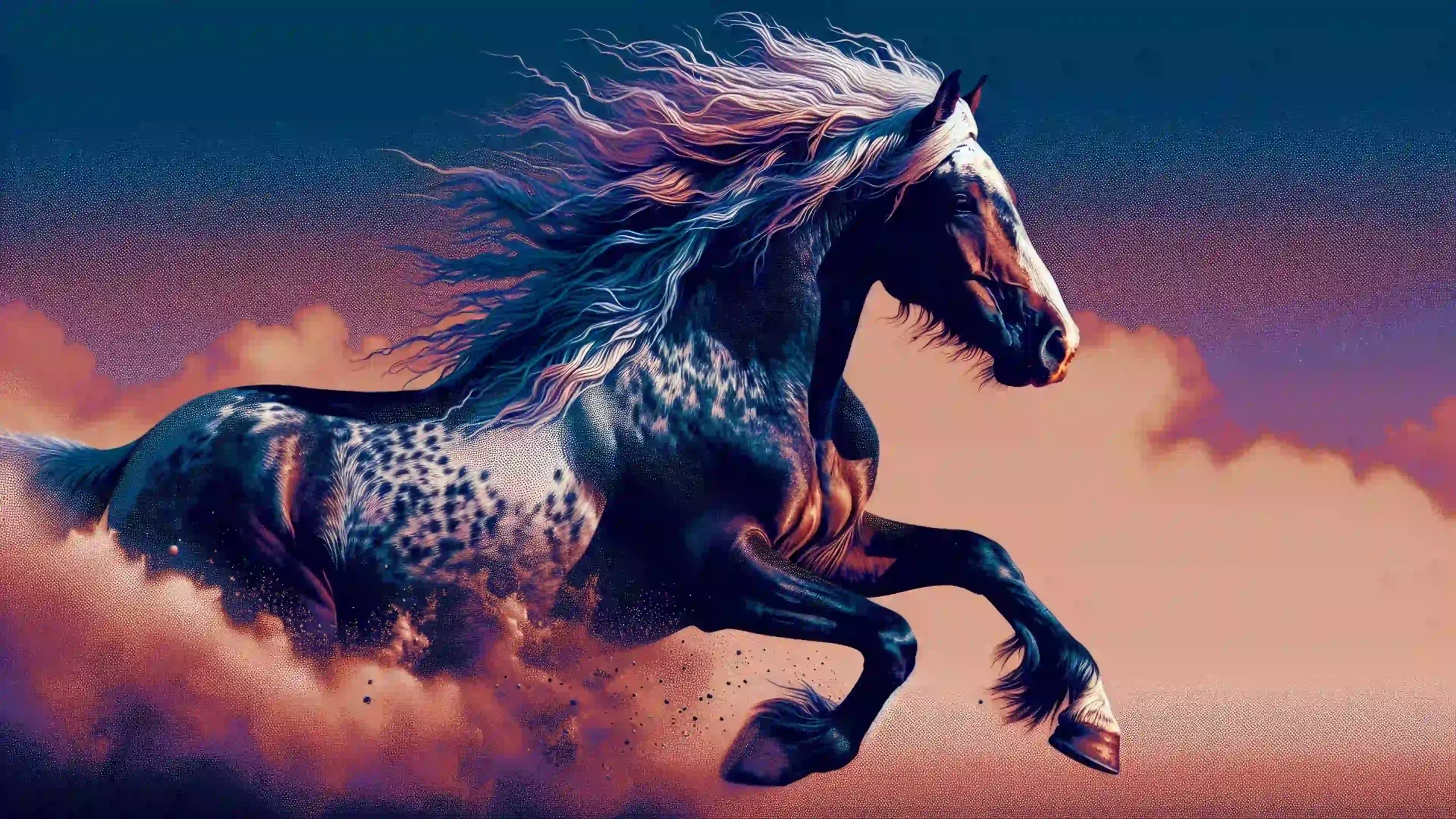 A majestic and dynamic 4K wallpaper that captures the untamed spirit of a horse in mid-gallop. The horse’s coat is a striking blend of dark tones and intricate light-colored spots, while its long, flowing mane and tail are a whirlwind of vibrant purples, pinks, and blues, suggesting a powerful, almost magical energy. The horse seems to be running on a cloud of dust that mirrors the colors of the twilight sky, creating a beautiful and ethereal sense of motion and freedom.