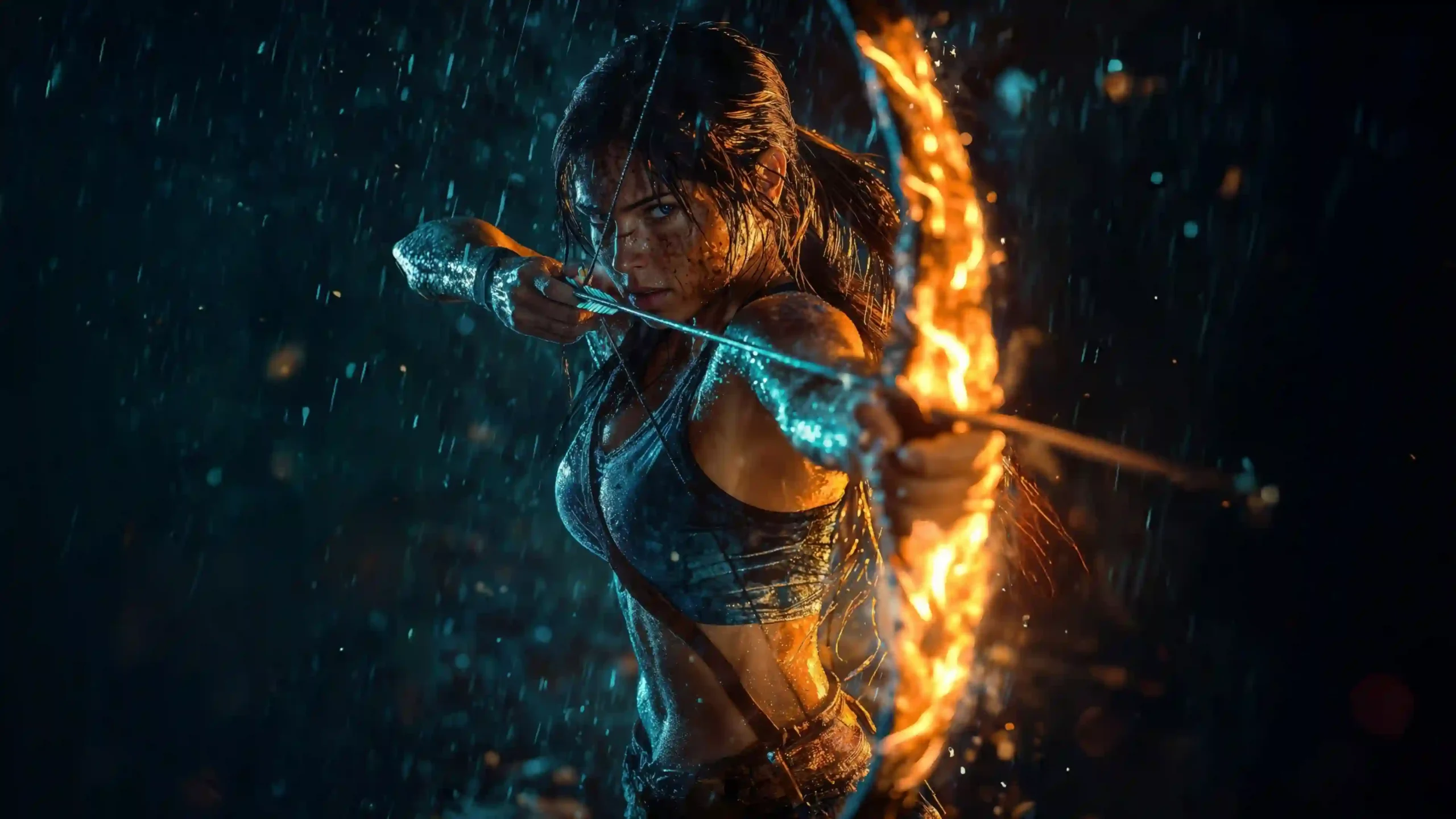 Capture the rugged determination of the legendary adventurer, Lara Croft, with this dramatic 4K digital art wallpaper. The image finds Lara mid-action, drenched in rain and mud, her face streaked with grime, embodying the ultimate survivalist. Her eyes are locked on her target, a look of fierce focus beneath her brow. The scene is dominated by a phenomenal contrast: the cold, stark blue light of the pouring rain and nighttime environment clashes with the powerful, searing orange flame engulfing the length of her bow. This duality perfectly represents the harsh world she inhabits and the fire of her spirit.
