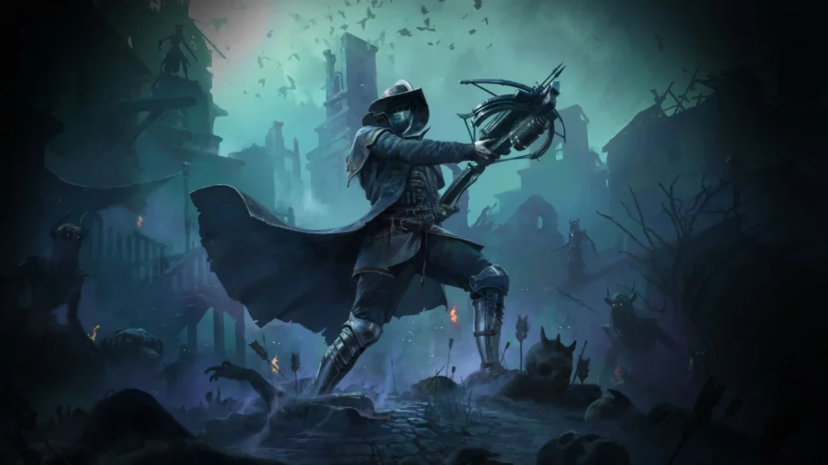 Casting a grim shadow over a blighted land, this 4K digital artwork features a formidable warrior from Path of Exile 2. Clad in a tattered duster and a wide-brimmed hat that partially conceals a metallic mask, the figure stands ready with a heavy, intricate crossbow. The background reveals a ruined, gothic cityscape under a sickly green moon, with bats or omens swarming in the air.