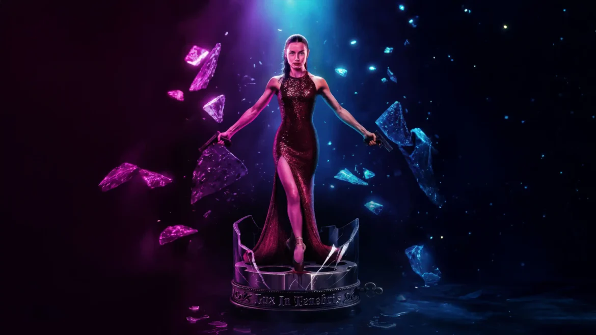 Command your screen with the deadly elegance of Ana de Armas in this electrifying 4K wallpaper inspired by her role as the assassin, Ballerina. Clad in a dazzling, high-slit sequined gown, she stands in a defiant, balanced pose, emphasizing both her dancer’s grace and her lethal intent. Her feet are poised on a shattered pedestal, while she wields twin pistols, ready for action. The scene is immersed in a dramatic, high-contrast lighting scheme—intense magenta bleeding into cold, dangerous cyan—as shards of ice or glass explode outward, symbolizing the chaotic impact of her presence.