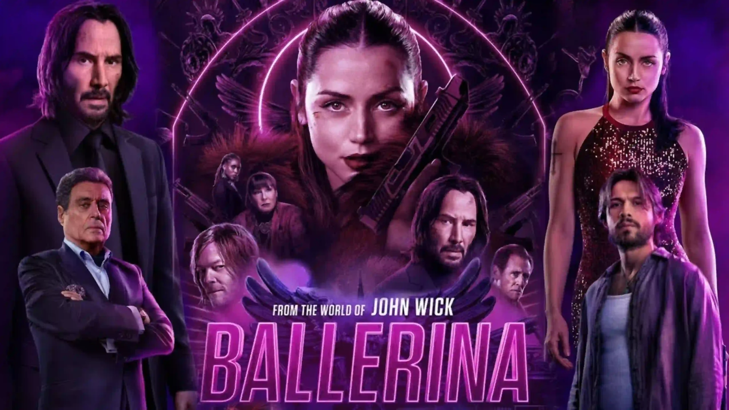 Immerse your screen in the sleek, high-octane world of John Wick Presents: Ballerina with this dynamic 4K wallpaper. Featuring a striking ensemble of characters against a vibrant purple and neon-lit backdrop, the central figure, Ana de Armas, commands attention with a determined gaze and a handgun. Key characters from the John Wick universe, including Keanu Reeves as John Wick himself, and new faces are strategically placed, promising intense action and intricate narratives. The overall design evokes the stylish, deadly elegance synonymous with the franchise.