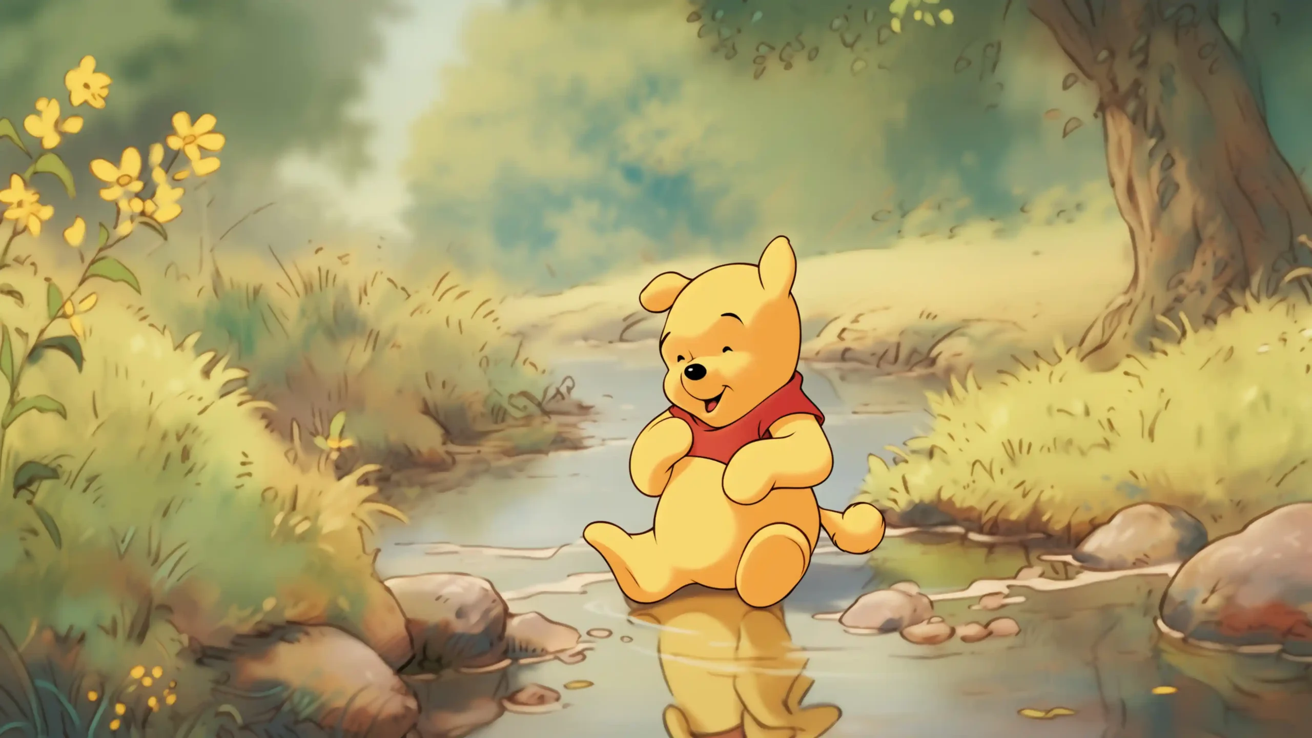Sitting peacefully in a shallow, sparkling stream, this 4K wallpaper features the beloved Winnie the Pooh in a soft, painterly illustration style. Surrounded by sun-drenched greenery and delicate yellow wildflowers, Pooh is depicted with a gentle, joyful expression as he enjoys a quiet moment in the Hundred Acre Wood.