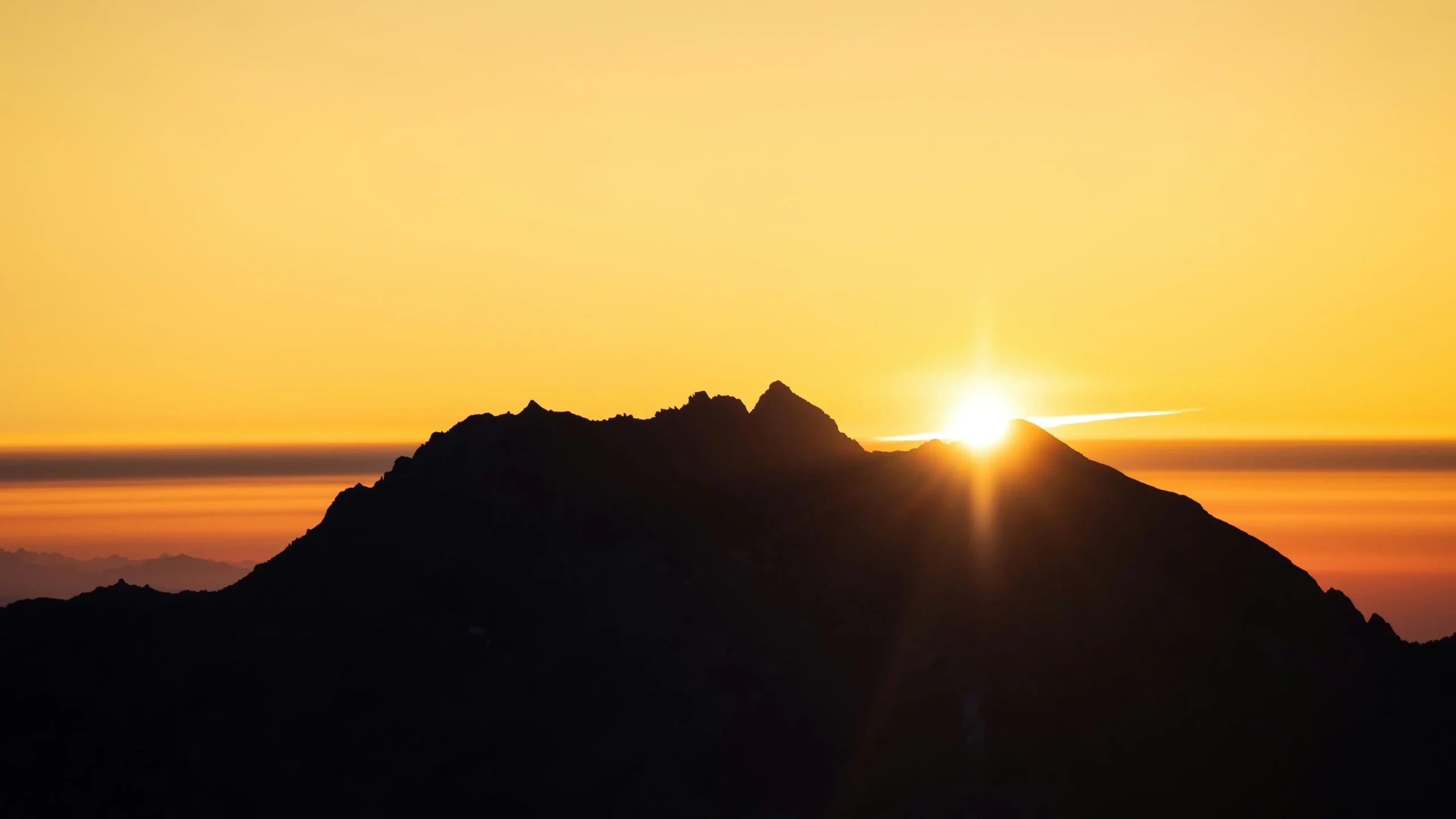 A stunning and serene 4K wallpaper capturing the silent grandeur of a mountain sunset. The silhouette of a rugged mountain range dominates the lower half of the frame, its jagged peaks a dark contrast against a brilliant sky. The sun, a powerful starburst of light, dips just behind one of the peaks, casting a fiery glow and long, warm streaks of orange and yellow across the horizon. The image is a quiet moment of perfect beauty and timeless power.
