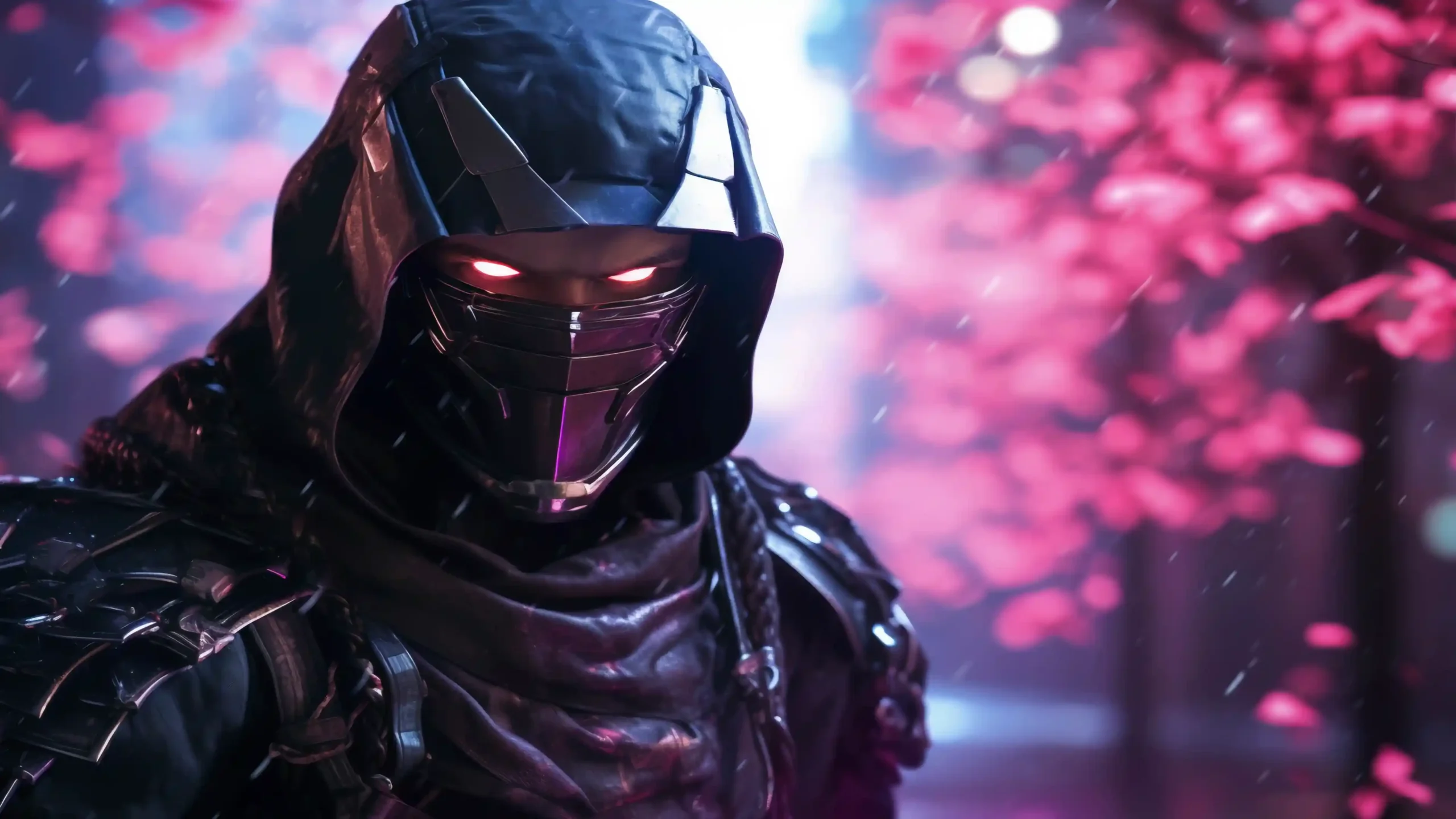 Bathed in the ethereal glow of neon sakura, the masked warrior emerges—eyes burning red, armor laced with secrets. Rain whispers down as steel meets silence. In this city of light and shadow, justice wears a hood and speaks only through action.