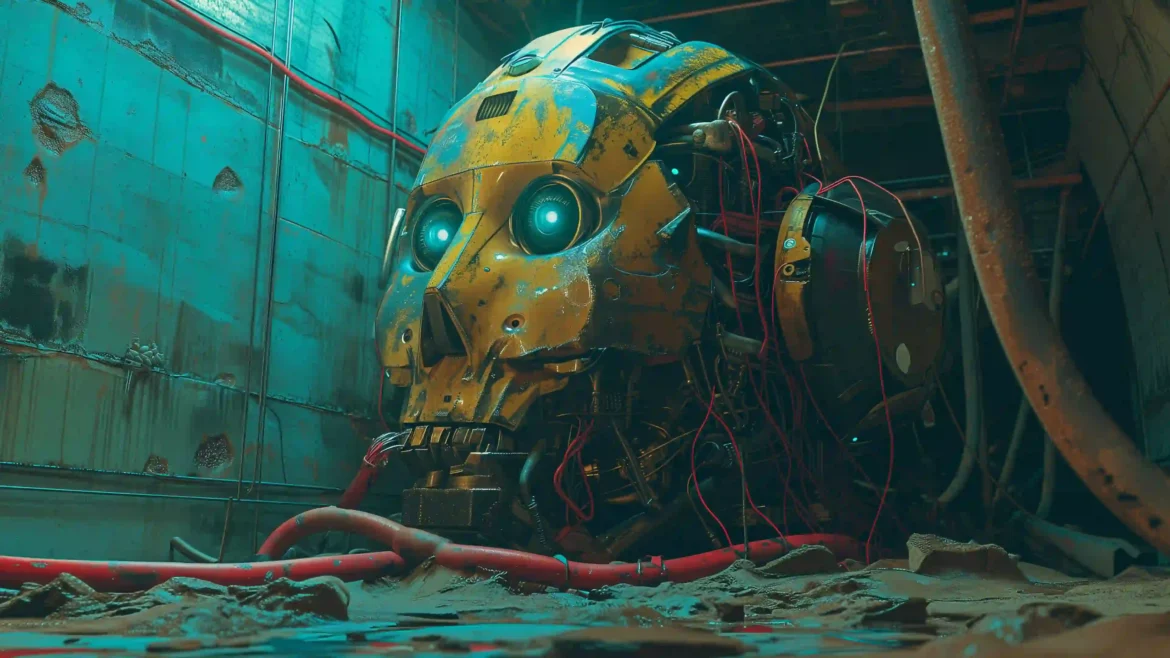 Adorn your screen with the gritty complexity of this 4K wallpaper featuring a rusted, cybernetic skull. This elaborate creation, part human and part machine, is a masterpiece of digital art. Glowing blue eyes peer out from the intricate metal and wiring, which are covered in a textured, distressed yellow and blue patina. Red wires and tubes snake around the structure, hinting at its mechanical life force, all set against a dark, industrial background. This image is a perfect fusion of human anatomy and futuristic robotics, ideal for fans of steampunk and dystopian aesthetics.