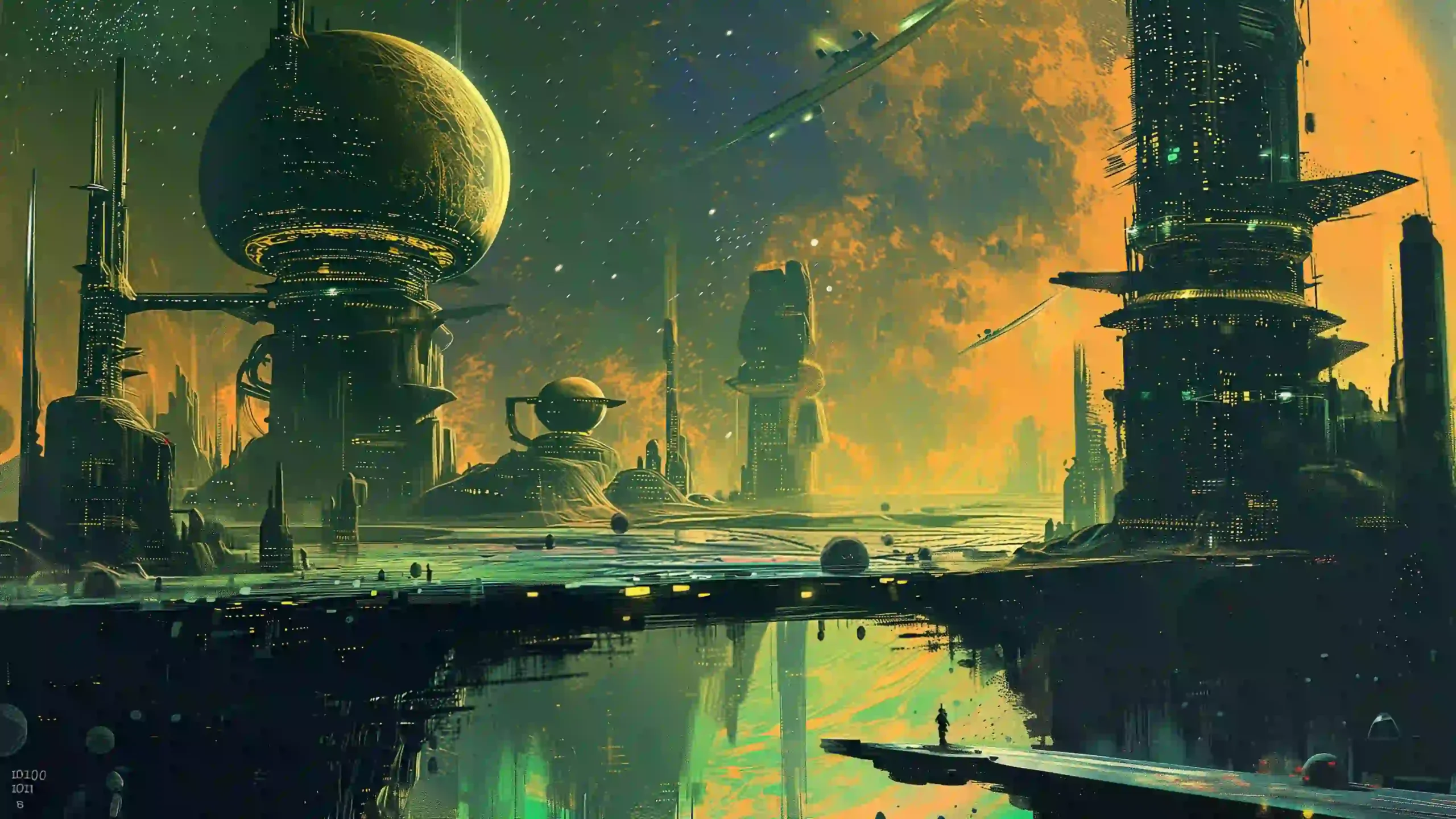 Transport yourself to the edge of the known universe with this captivating 4K wallpaper. Illuminated by a colossal, gas-giant planet, a futuristic city sprawls across a watery landscape. Its towering spires and spherical structures gleam with the light of a thousand windows, reflecting off the tranquil surface below. In the distance, sleek starships navigate the hazy, alien atmosphere, while a lone figure stands on a precipice, gazing out at the breathtaking, cosmic panorama. This is a vision of humanity’s destiny, a testament to ingenuity and the enduring quest for a home among the stars.