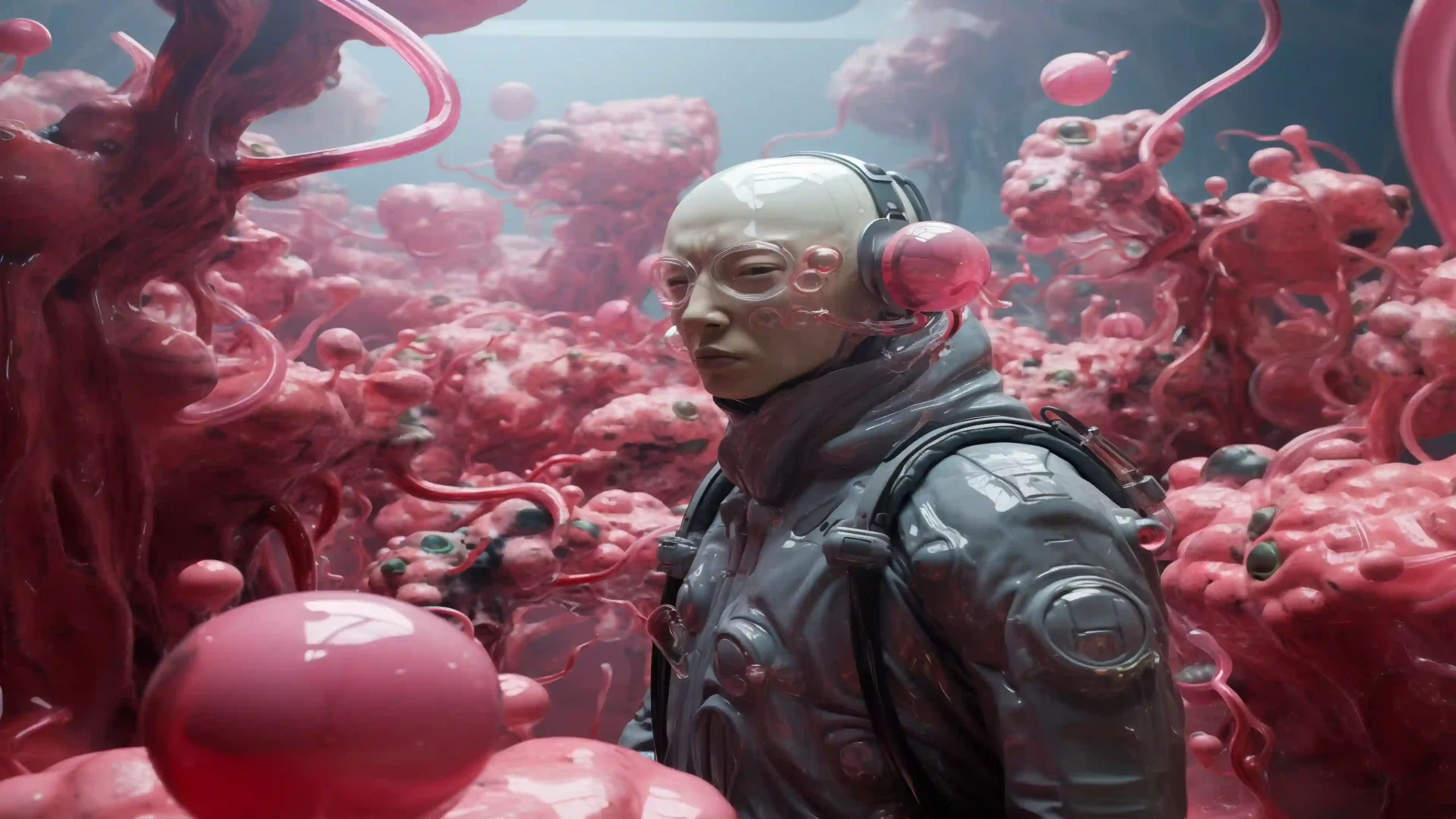 Step into a bizarre and beautiful alien ecosystem with this stunning 4K wallpaper. It features a figure with a shaved head, wearing a sleek, gray futuristic survival suit and large headphones. The most unique elements are their clear, bubble-like goggles and the vibrant pink, fleshy, organic matter that completely surrounds them, hanging from the ceiling like vines and pulsating like a dense, alien garden. The figure’s expression is one of calm, focused determination amidst the strange, brightly lit, and highly detailed environment.