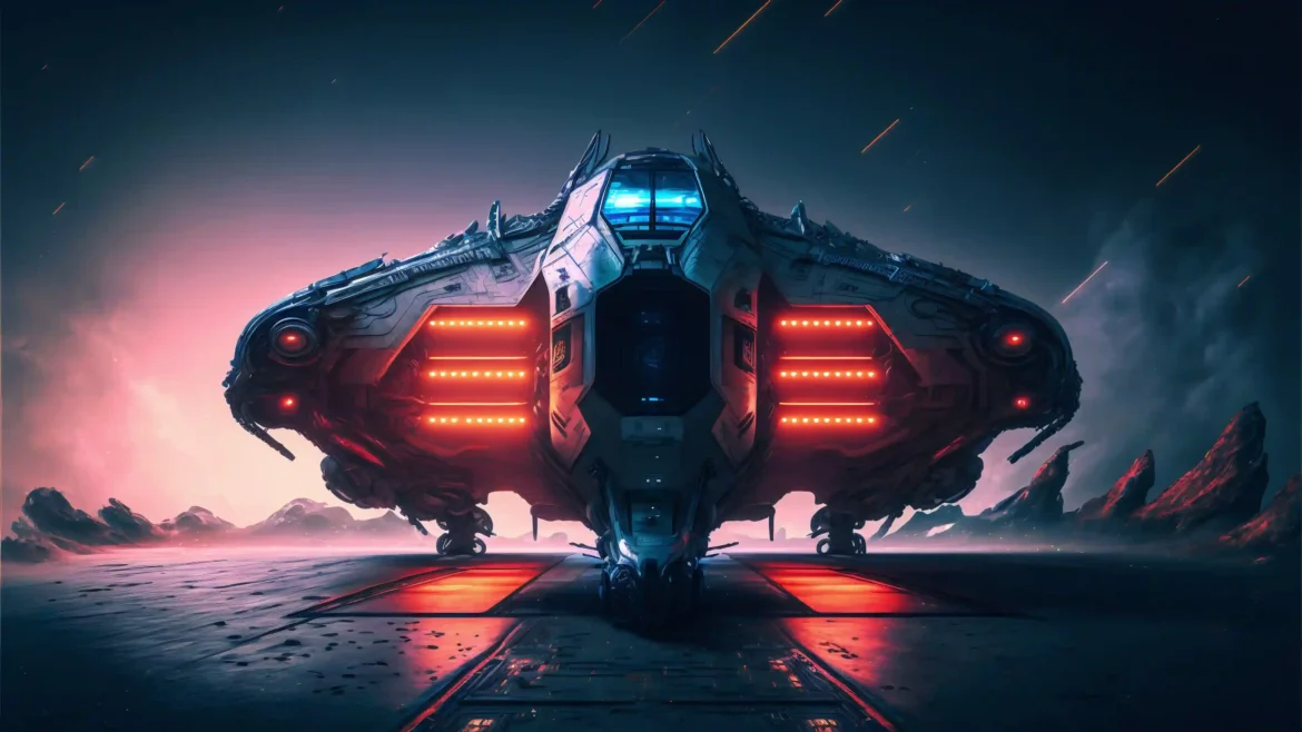 This stunning 4K wallpaper captures the epic moment of a futuristic starship landing on an alien world. The vessel’s powerful engines glow with a fiery red light, illuminating the rugged, rocky terrain and the misty atmosphere around it. Its sleek, industrial design and the bright, cockpit windows give a sense of purpose and high-tech adventure. Streaks of light pierce the twilight sky, hinting at the vastness of space and the incredible journey just completed.