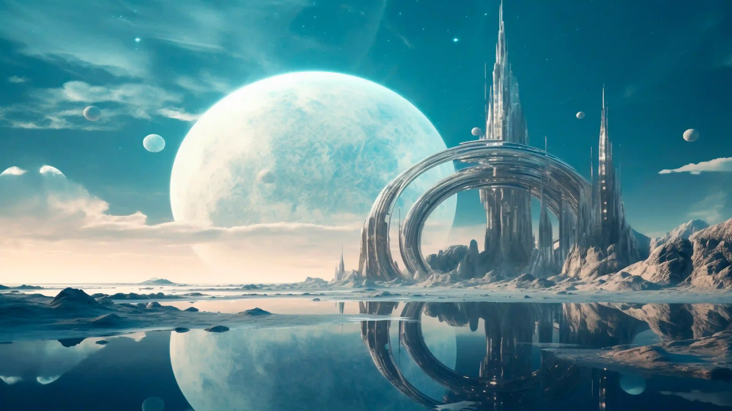 The atmosphere is serene and ethereal, bathed in soft cyan, white, and subtle pink hues. The scene is perfectly reflected in a calm body of water in the foreground, doubling the visual impact and lending a sense of immense tranquility and isolation. It’s a compelling blend of science fiction grandiosity and natural beauty, making you feel the cool, quiet awe of standing on the edge of a new civilization.