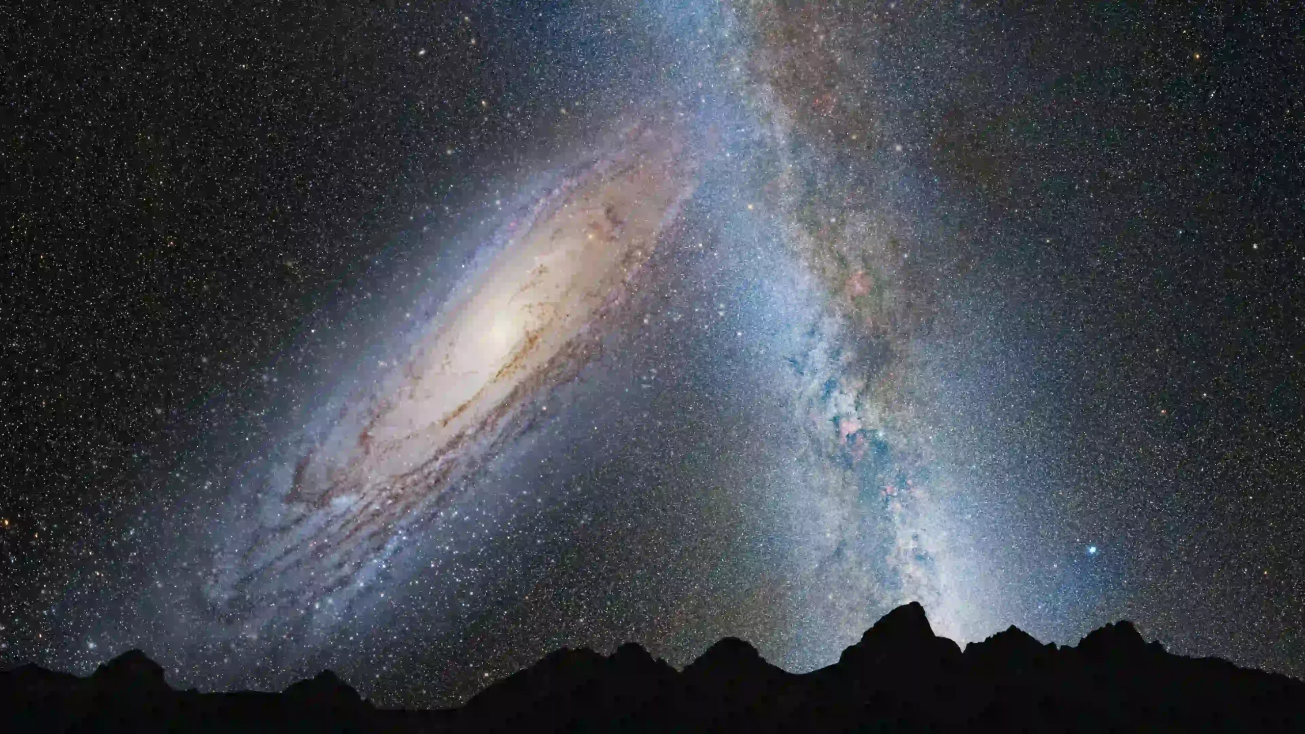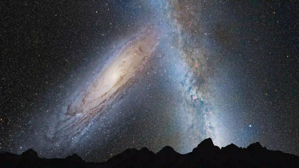 The sheer scale of the universe unfolds in this breathtaking celestial dance, where the majestic Andromeda Galaxy looms large over a jagged mountain silhouette. Across the velvet expanse of the night sky, the glowing band of the Milky Way stretches like a river of stardust, meeting the spiraling brilliance of our galactic neighbor. Millions of distant suns flicker in the deep void, creating a tapestry of light that has traveled across eons to reach our eyes.