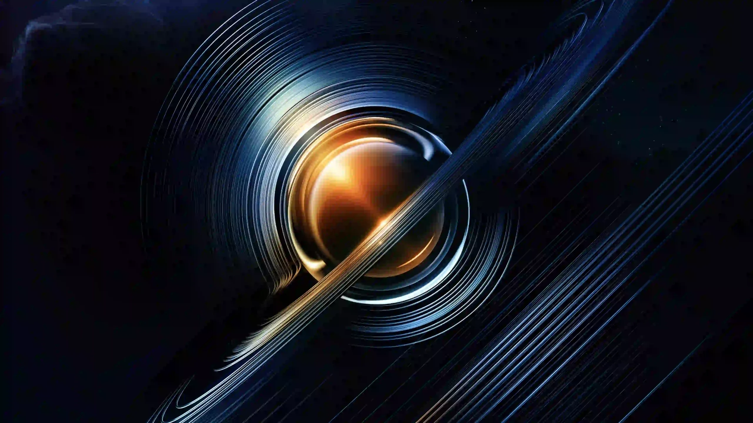 Journey to the outer reaches of our solar system with this mesmerizing 4K wallpaper of Saturn. Reimagined with a high-fidelity, artistic lens, the gas giant glows with a warm, molten amber core, while its iconic rings are rendered as sharp, concentric grooves reminiscent of a cosmic vinyl record. Set against an absolute black void, the planet’s rings arc across the frame in a brilliant display of cool blue and silver light, creating a striking contrast between the fiery planet and its icy halo.