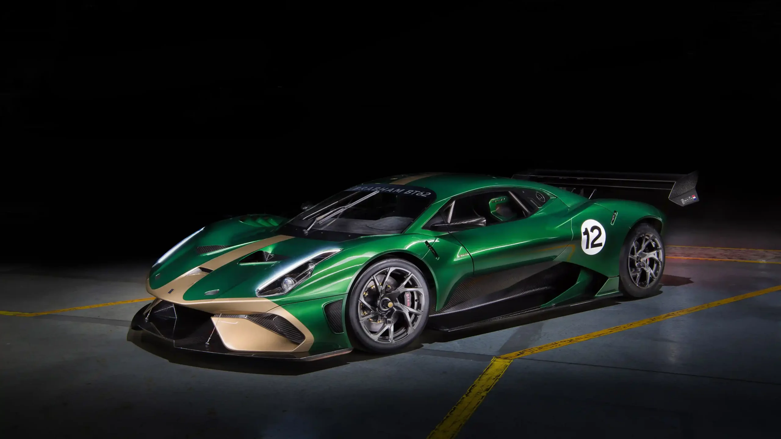Experience the raw power of track-focused engineering with this stunning 4K wallpaper of the Brabham BT62. Captured in a dark, atmospheric garage setting, the hypercar’s vibrant British Racing Green paint and striking gold accents gleam under precision lighting. Featuring the iconic number 12 and aggressive carbon-fiber aerodynamics, this composition highlights the uncompromising performance and legacy of the Brabham name.