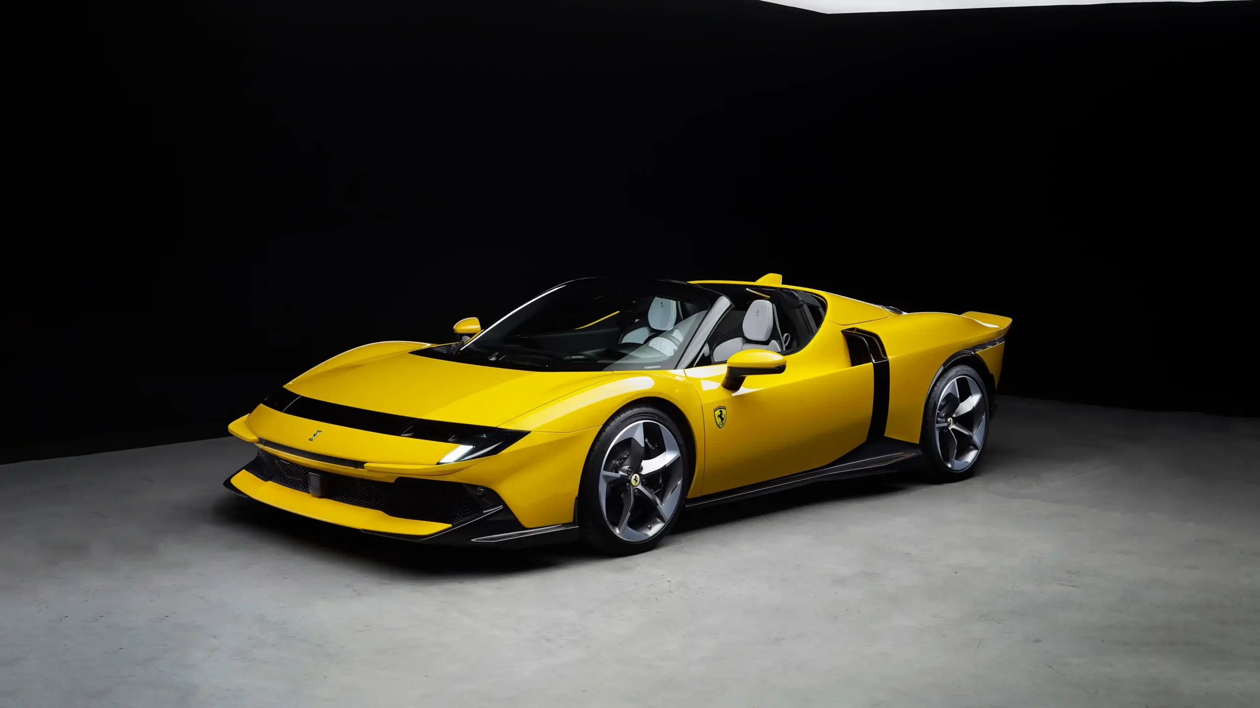 Step into the realm of elite performance with this striking 4K wallpaper. It showcases a brilliant yellow Ferrari Daytona SP3 (or a similar modern model) in a dramatic studio setting. The car’s aggressive, low-slung profile and sculpted lines are perfectly highlighted by a focused spotlight, contrasting sharply against the smooth gray floor and the intense black background. The bright yellow paint gleams, emphasizing the vehicle’s aerodynamic bodywork and detailed silver wheels, capturing the essence of Italian high-performance engineering.
