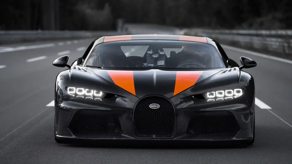 Experience the absolute peak of automotive engineering with this 4K wallpaper of the Bugatti Chiron Super Sport 300+. The image showcases the hypercar’s aggressive front profile, featuring its signature exposed carbon fiber body accented by bold orange racing stripes. Set on a high-speed test track, the quad-LED headlights and iconic horseshoe grille command attention, reflecting the machine’s status as a record-breaking legend.