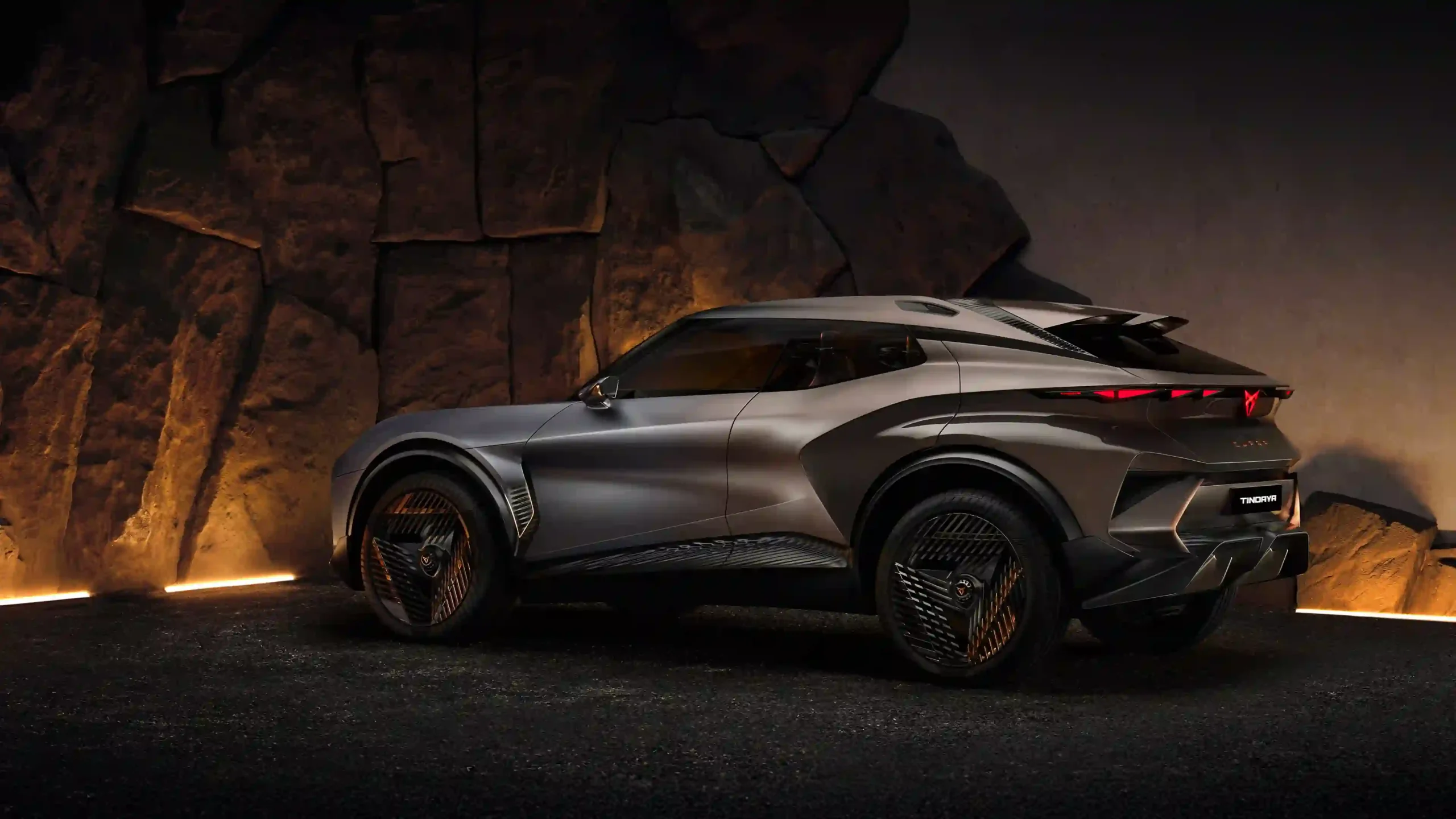 The striking Cupra Tindaya Concept is showcased from the rear in a moody, low-light setting against a backdrop of rugged, rocky cave walls. The vehicle’s design is aggressive and angular, finished in a stealthy, dark metallic gray that absorbs the ambient light. Its futuristic aesthetic is highlighted by the sharp, horizontal red taillights and the intricately designed, bronze-accented wheels. The dramatic lighting from below emphasizes its compact, powerful stance, suggesting an adventurous spirit fused with high performance.